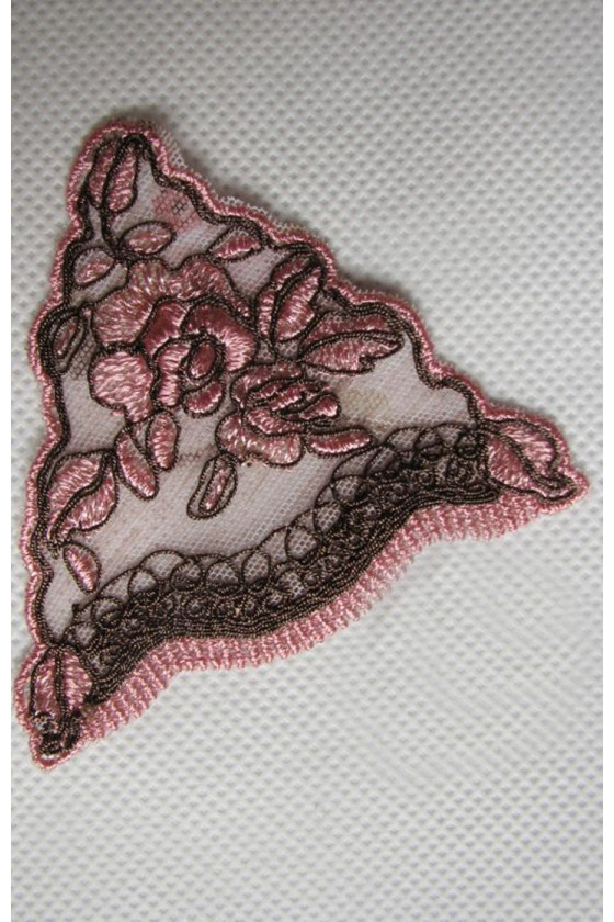 Galanterní květinová aplikace ve špinavě růžové a hnědé barvě.