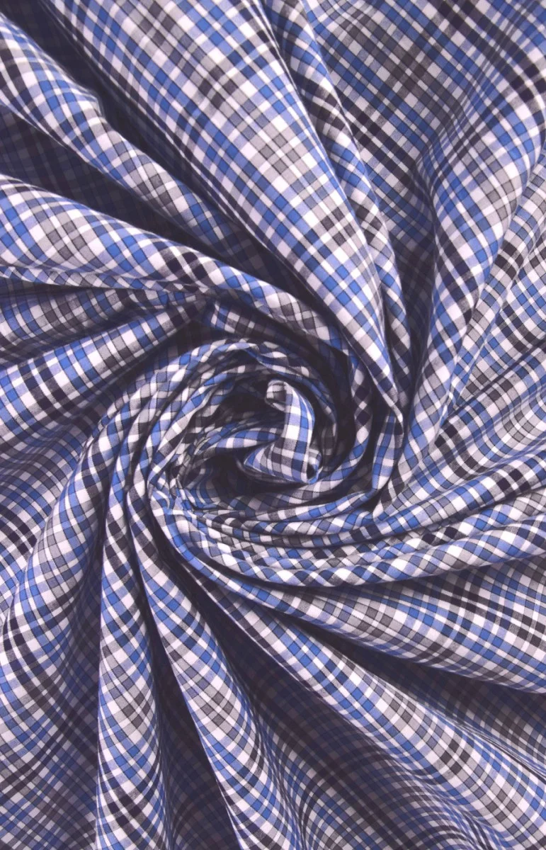 Košile bavlněná s bílou, grafitovou a modrou jemnou kárkou je 100% přírodní, recyklovatelná. Oblečení z něj je ideální pro horké dny. Doporučujeme pro šití košil, halenek, šatů nebo sukní.