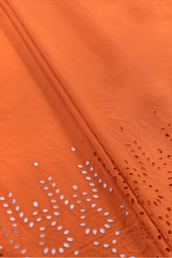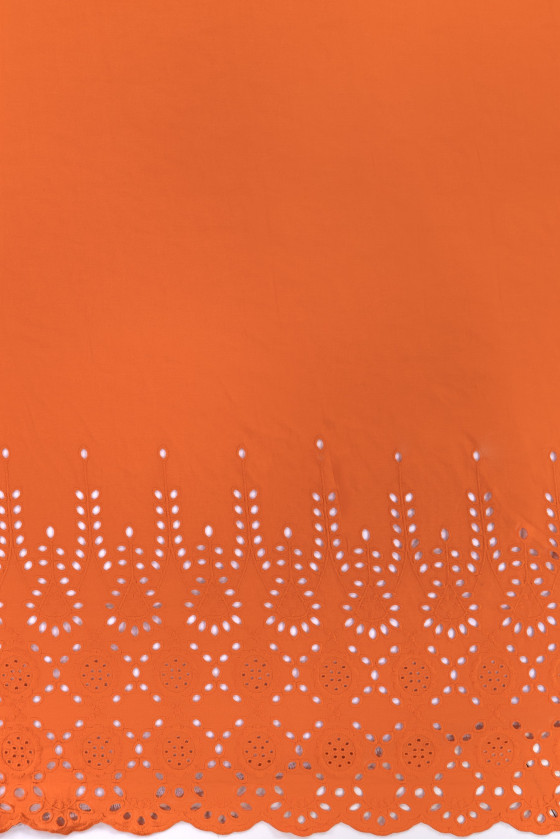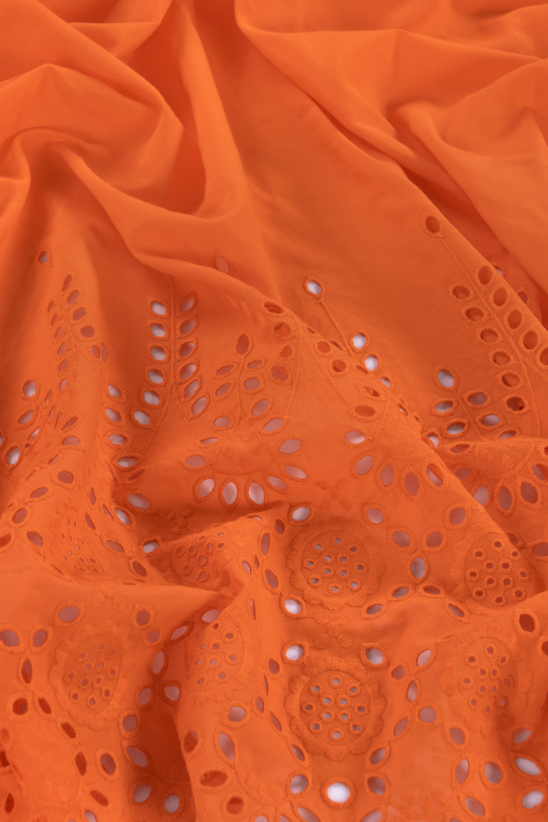 Italská bavlněná tkanina batiste v oranžové barvě. Látka na jedné straně lemu má ozdobnou výšivku richelieu o šířce 40 cm - šijeme ji po obvodu. Tenká, mírně průhledná, neelastická, velmi vzdušná látka - ideální pro šití halenky, šatů nebo sukně.