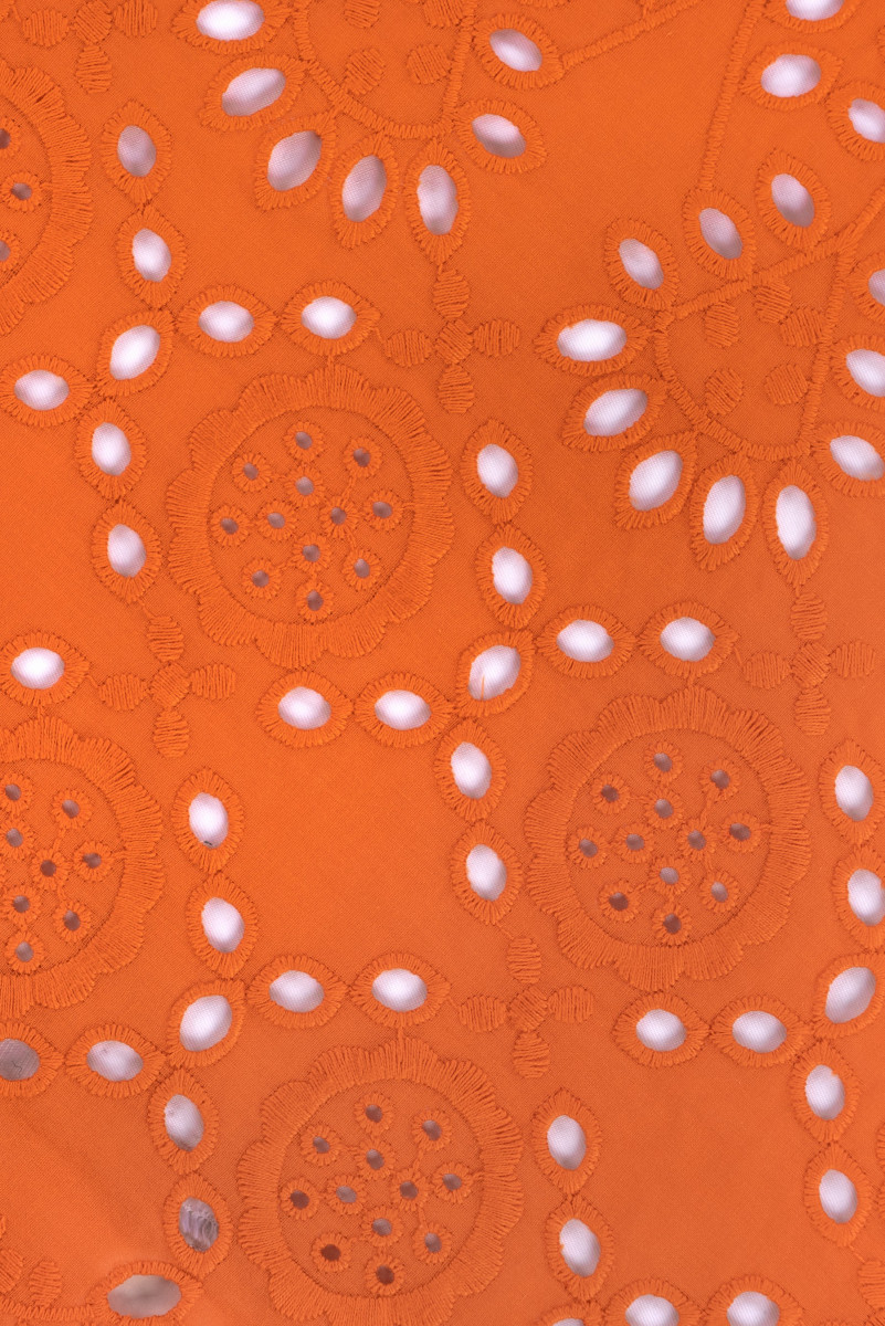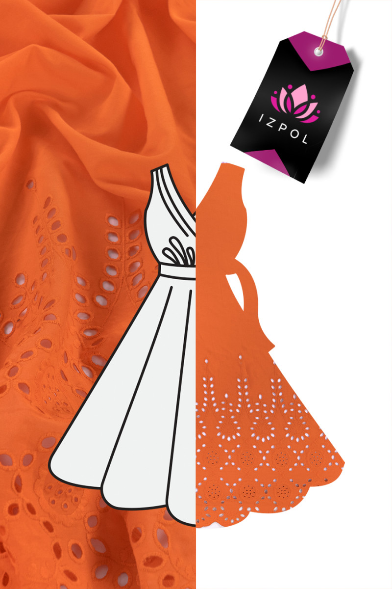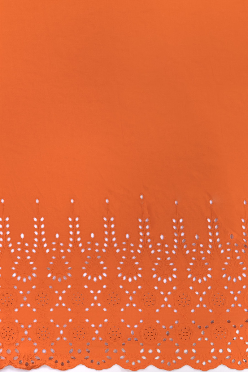 Italská bavlněná tkanina batiste v oranžové barvě. Látka na jedné straně lemu má ozdobnou výšivku richelieu o šířce 40 cm - šijeme po obvodu. Tkanina je tenká, mírně průhledná, neelastická, velmi prodyšná.