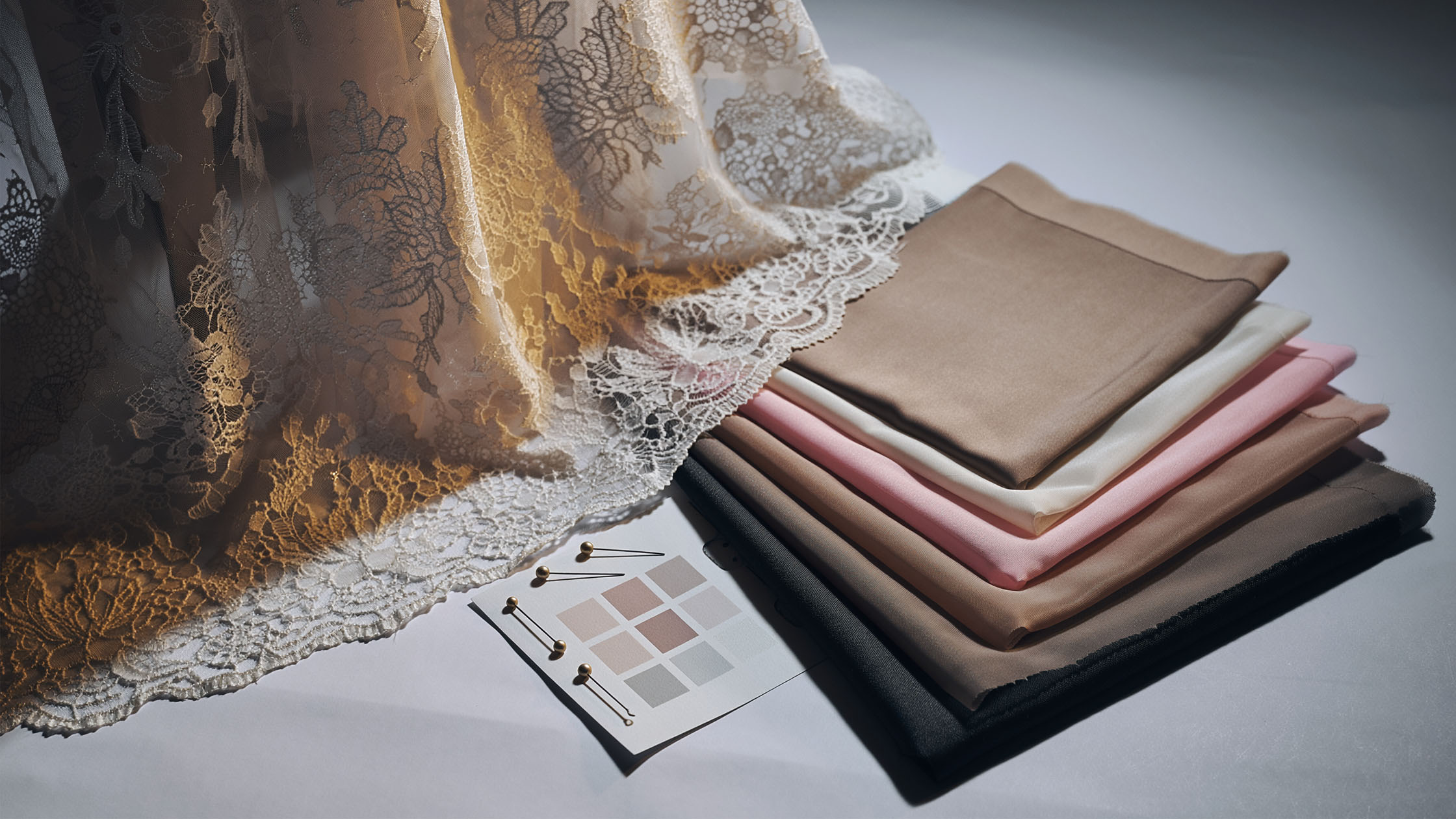Otevřená struktura materiálu činí to, co je pod povrchem, stejně důležitým jako samotnou vrchní vrstvu. Podšívka zde funguje jako plátno, na kterém odhalujete složitý vzor výšivky nebo tkaní. Pokud zvolíte špatný podklad, můžete úplně ztratit kresbu krajky, což z dálky způsobí, že bude vypadat jako hladká a nezajímavá látka. Podšívku musíte považovat za pozadí, které buď zvýrazní trojrozměrnost vzoru, nebo ji zploští a zakryje. Příliš lesklá podšívka může odvádět pozornost od matné krajky a vytvářet nechtěnou optickou disonanci, zatímco příliš matná podšívka může celý materiál opticky ztěžkovat a bez života. Vaším cílem je najít rovnováhu, která umožní koruně hrát první housle a zároveň zajistit plné pokrytí na strategických místech v siluetě.