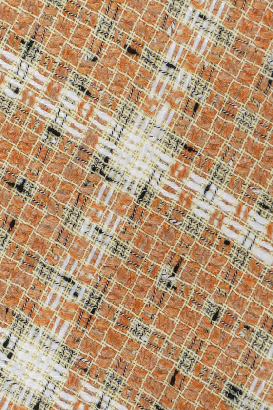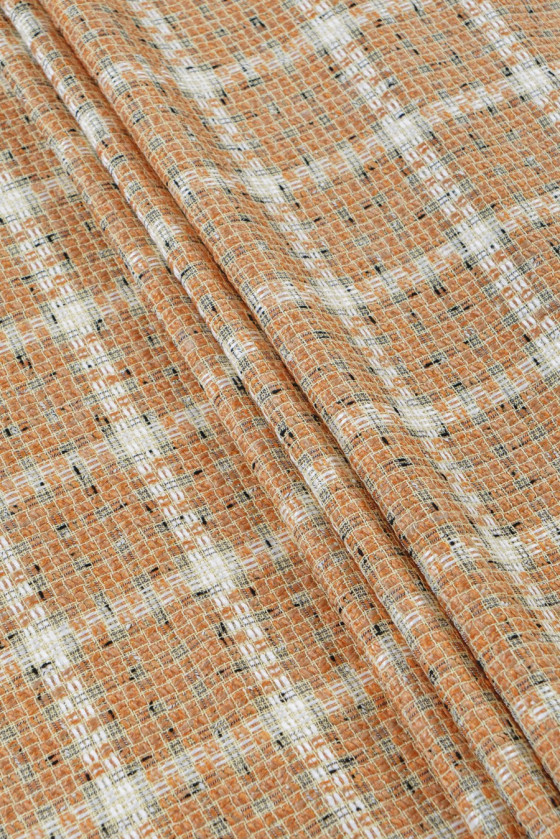 Látka Chanel v měděné, béžové a bílé barvě s jemnou černou nití. Vzor tvoří kostku o velikosti 10 x 10 cm. Látka je tkaná na volné bavlněné osnově z akrylových nití. Doporučujeme pro šití šatů, bund, kardiganů. Tkanina vyžaduje podšívku.