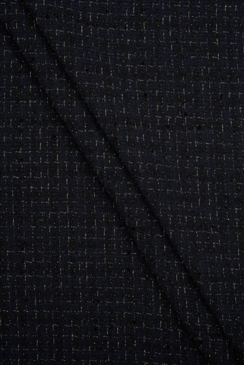 Italská vlněná látka typu Chanel v tmavě námořnické modři. Celý materiál je zdoben pravidelně tkanou zlatou, lesklou a matnou černou nití. Látka je jemně položená, středně silná, neelastická a vyrobená z mírně volné tkaniny typické pro tento žánr a s výraznou strukturou nití, které mírně vyčnívají. Krásná nabídka pro ty, kteří hledají elegantní látky z přírodních surovin. Lze ji použít k šití kostýmu, sukně, saka nebo šatů.