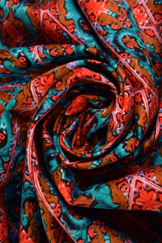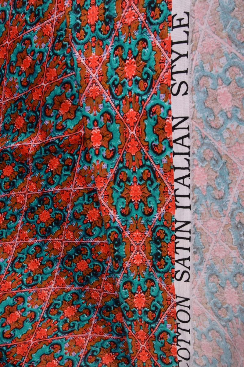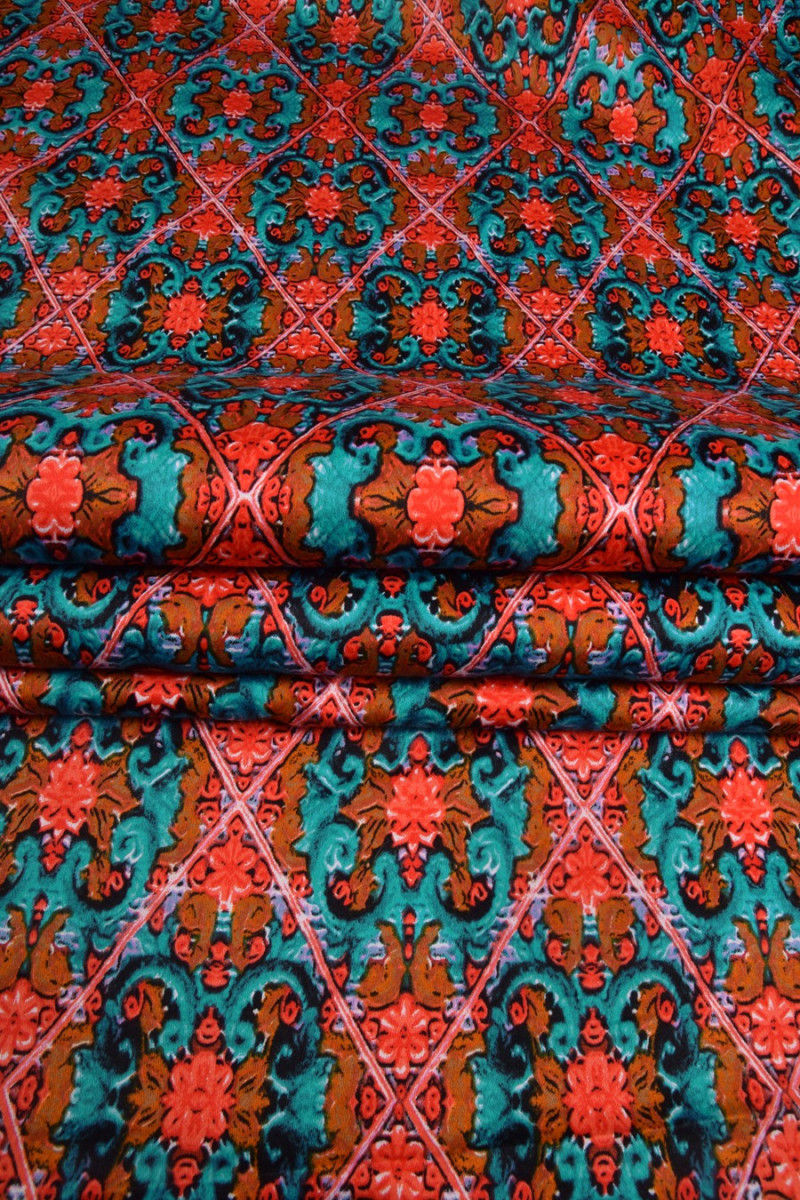 Barevná bavlna, mírně elastická. Ornamentální, barevný vzor umístěný v diamantech. Barvy: tyrkysová, hnědá a jasně červená. Návrh na šití šatů, sukní, kalhot.