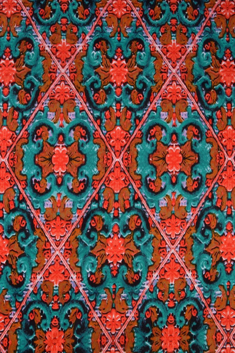 Barevná bavlna, mírně elastická. Ornamentální, barevný vzor umístěný v diamantech. Barvy: tyrkysová, hnědá a jasně červená. Návrh na ušití letních šatů, sukní, kalhot