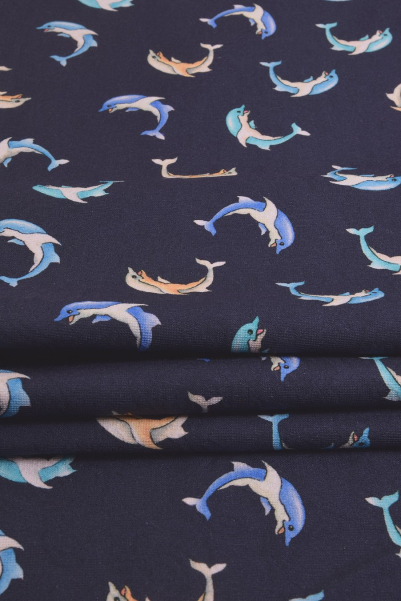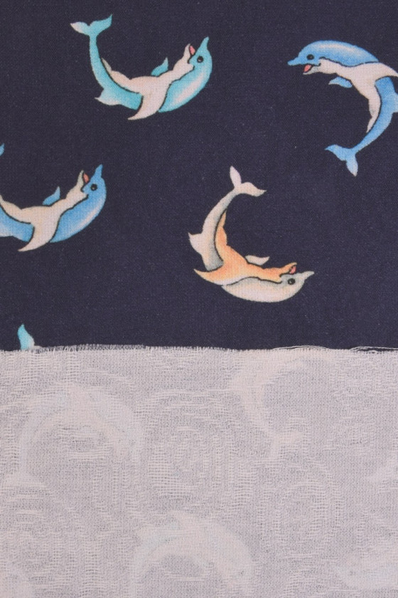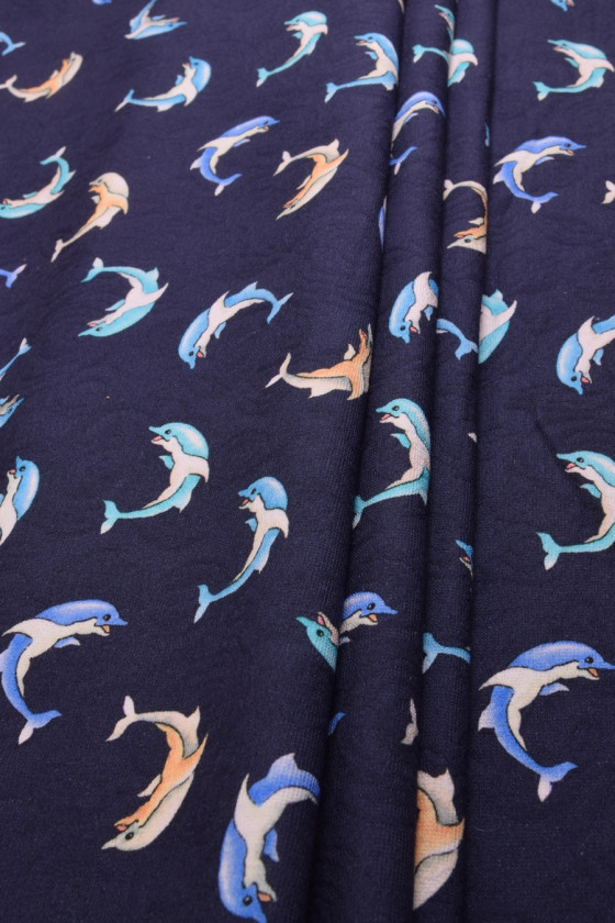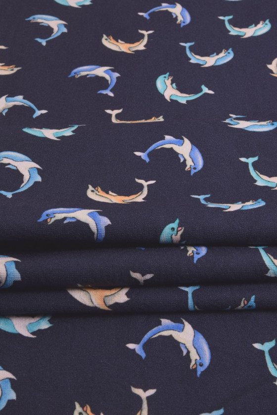 Silnější, tmavě modrá žakárová bavlna s potiskem barevných delfínů (velikost cca 4 cm)