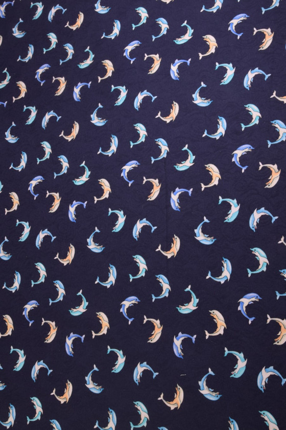Silnější, tmavě modrá žakárová bavlna s potiskem barevných delfínů (velikost cca 4 cm). Doporučujeme pro šití šatů, kalhot, sukní, bund.