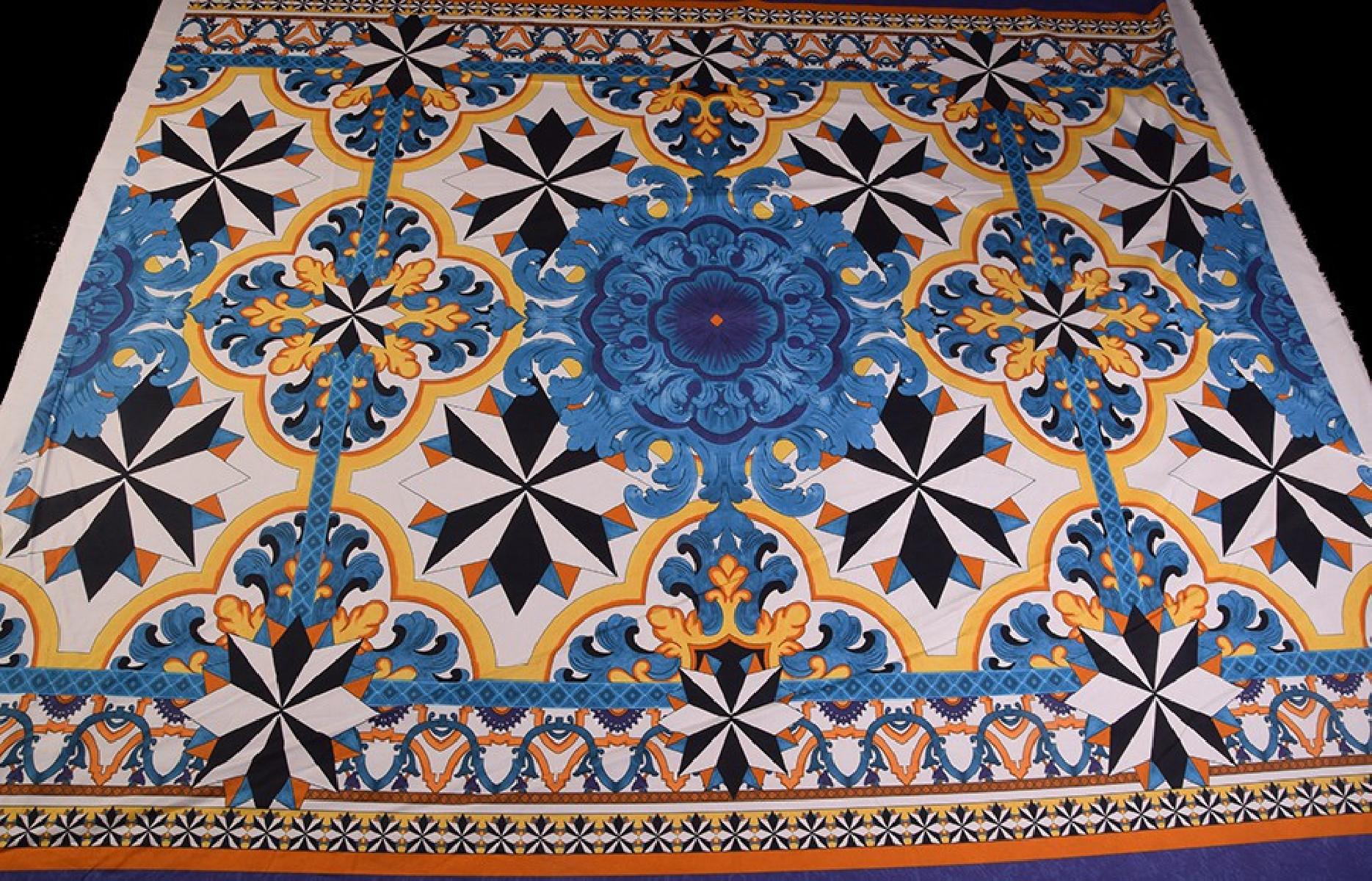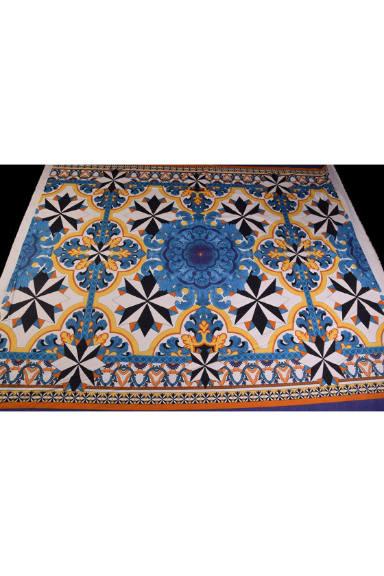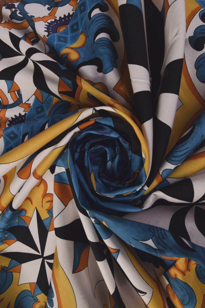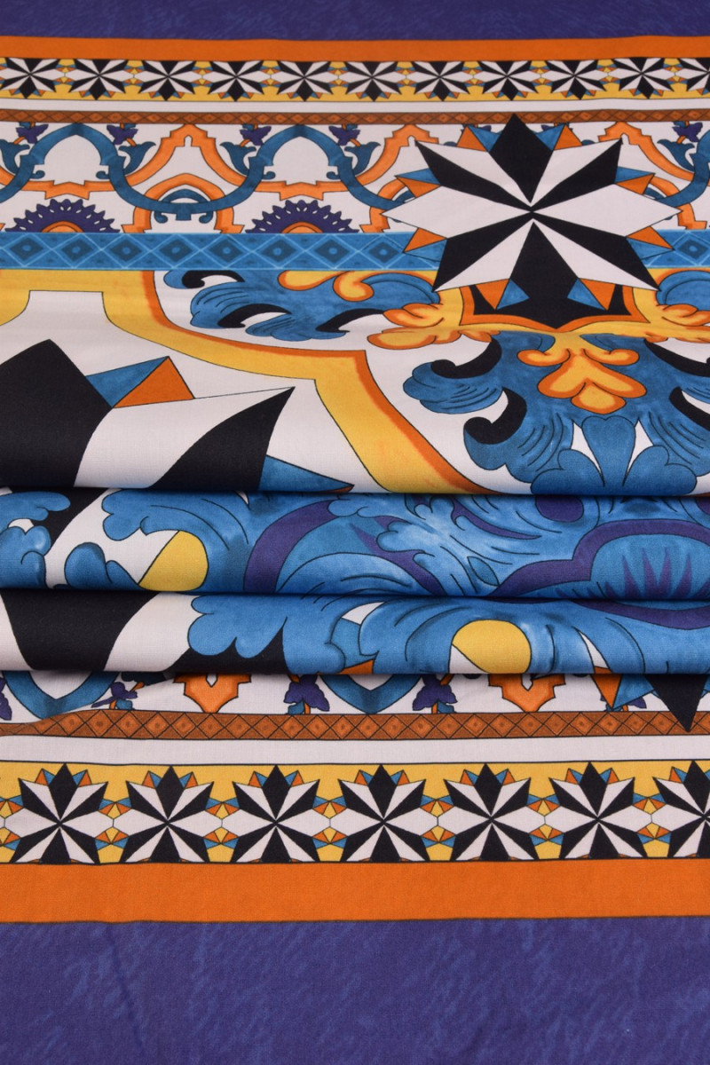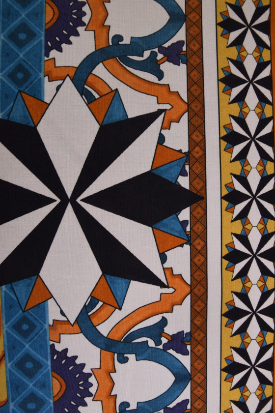Italská bavlněná tkanina ve velikosti kupónu 130 cm * 140 cm. Velmi zajímavý, orientální vzor v černé, žluté a modré barvě.