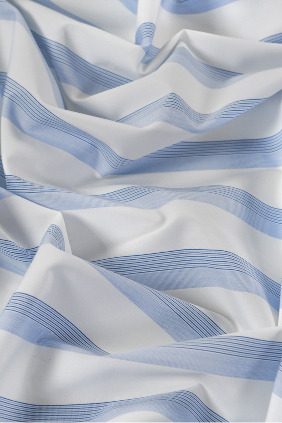 Italská bavlněná košile v krémové barvě s motivem modrých pruhů, široká 2 cm. Neelastická, mírně tuhá tkanina - ideální pro ušití košile, halenky, šatů.
