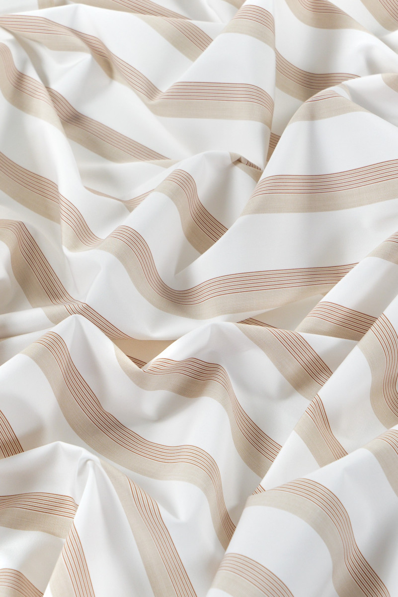 Italská bavlněná košile v krémové barvě s motivem béžových proužků, široká 2 cm. Neelastická, mírně tuhá tkanina - ideální pro ušití košile, halenky, šatů.