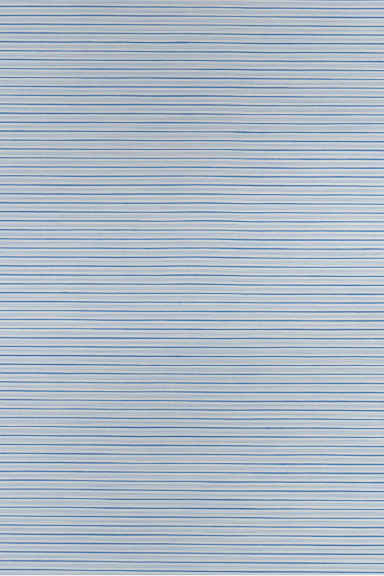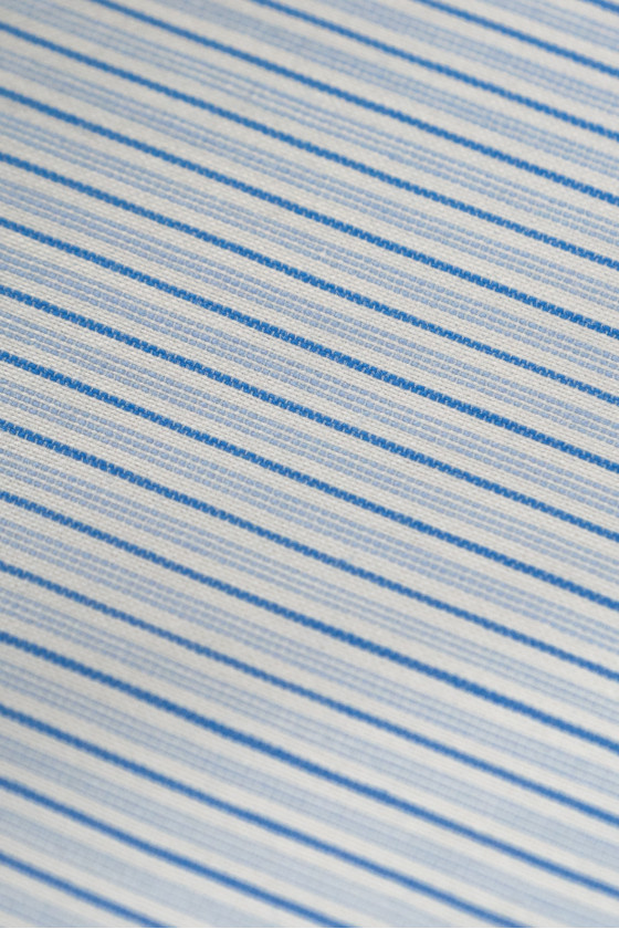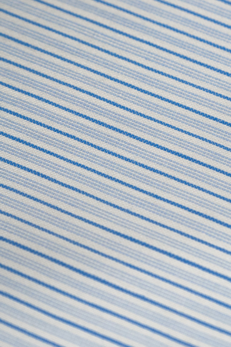 Italská bavlněná látka s úzkými pruhy v krémové a modré barvě.
