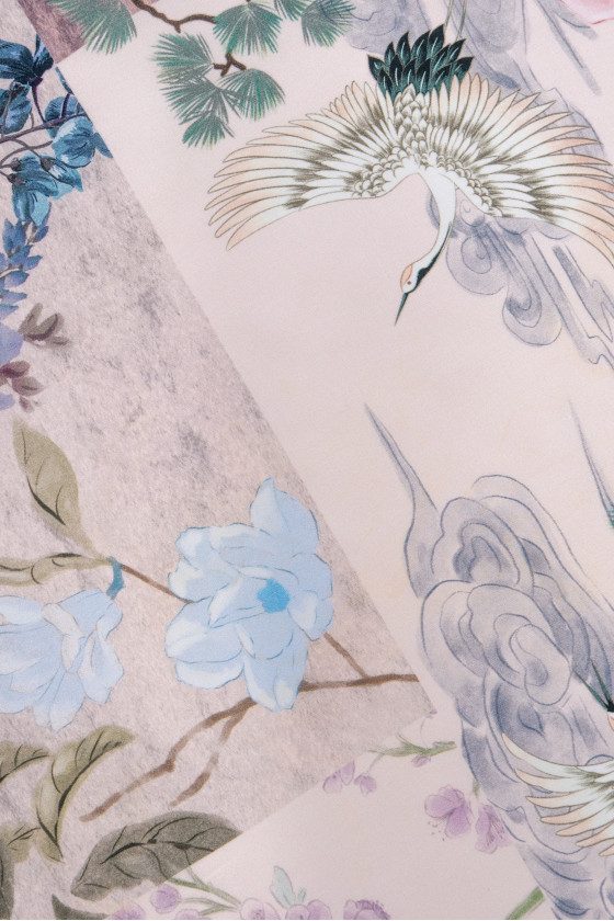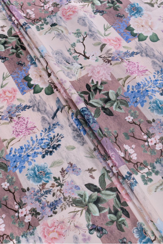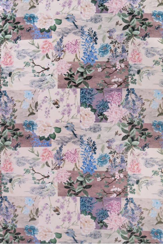 Italská košilová bavlna s patchworkovým efektem s květinovými a ptačími motivy v pastelových barvách. Látka je tenká, ale neprůhledná, mírně elastická, matná.