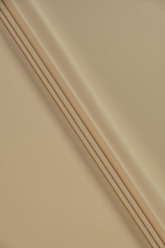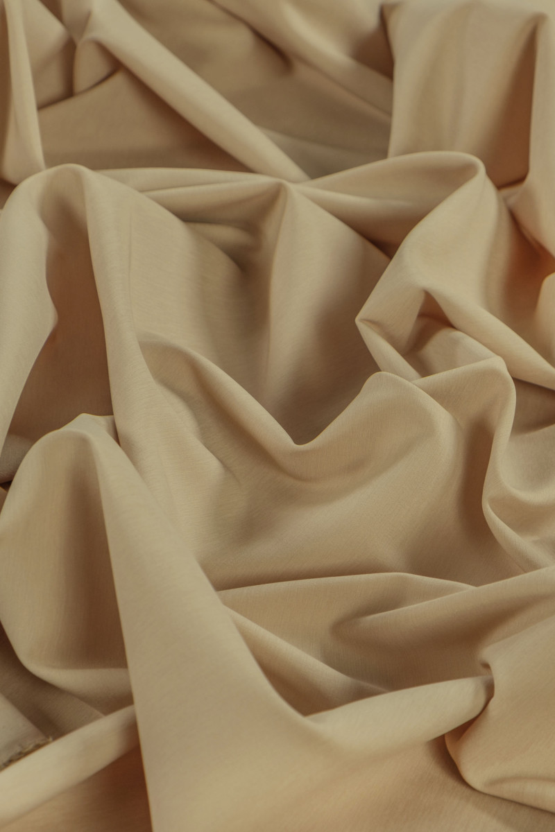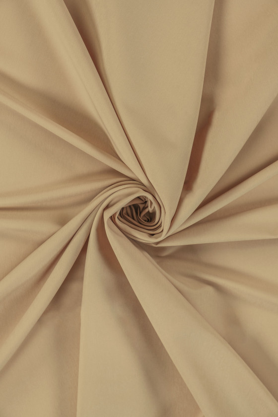 Italská bavlněná tkanina s přídavkem viskózy a elastanu v béžové barvě. Látka je mírně tuhá, s jemnou saténovou vazbou na jedné straně. Velmi dobře se natahuje, takže je ideální pro ušití vypasovaných šatů, sukně nebo šortek. Díky přírodnímu složení je skvělou látkou na jaro a léto.