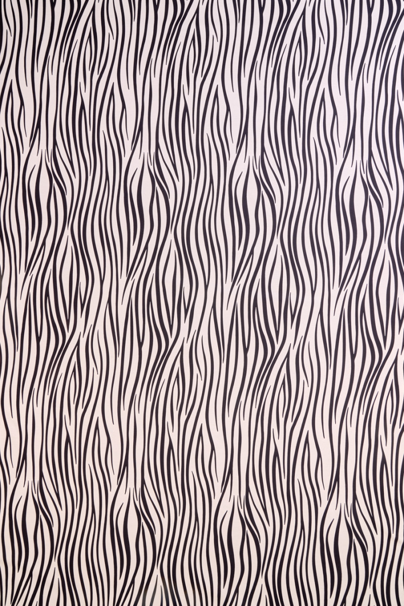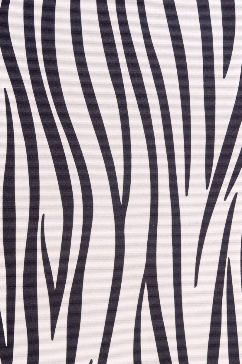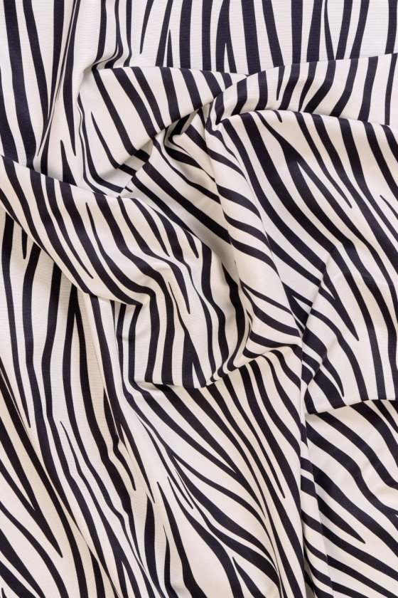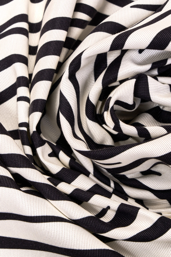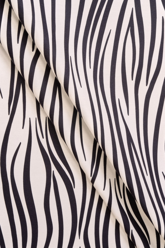 Italská bavlněná látka s přídavkem grogrénového hedvábí v krémové barvě s motivem černé zebry. Skvělá nabídka pro fanoušky značkového oblečení, protože je podepsána jménem známého módního návrháře. Tkanina je neelastická, mírně tuhá. Ideální pro sukně, tenké kabáty a dokonce i šaty.
