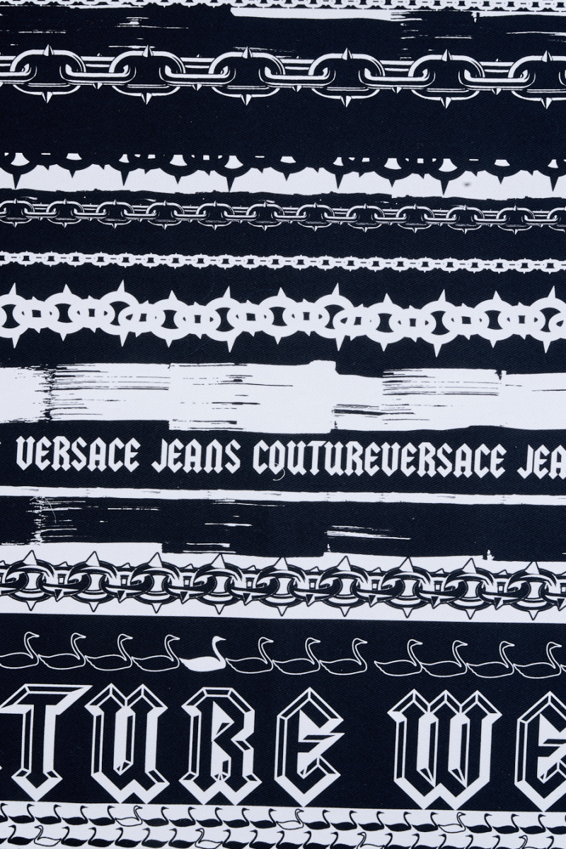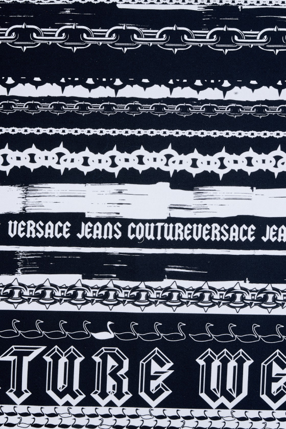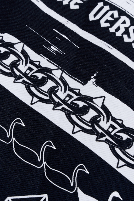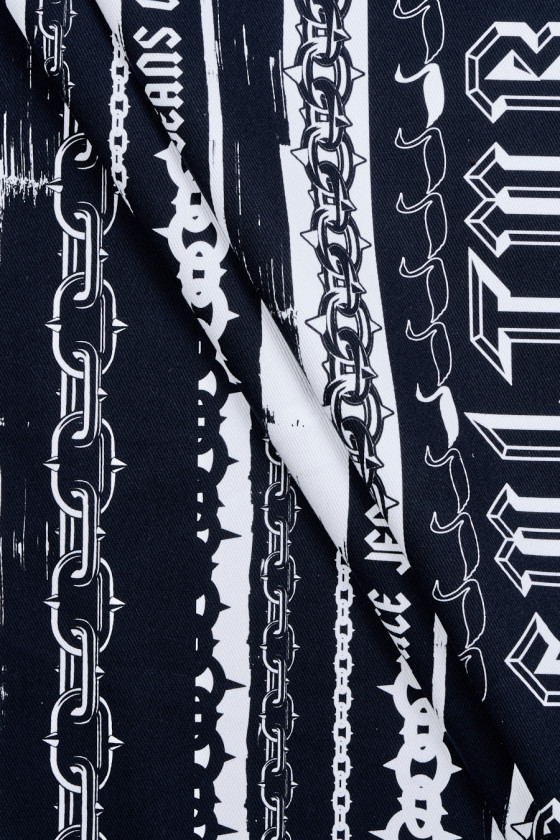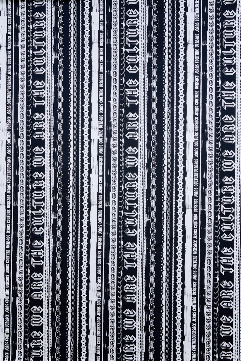 Italská bavlněná látka, kepr s černobílými vzory zobrazujícími řetězy, labutě a nápisy. Látka je silnější, elastická, hezky sedí a pochází z kolekce známého módního návrháře. Vynikající nabídka pro fanoušky značkových designů, je ideální pro katany, vesty, sukně a kalhoty.