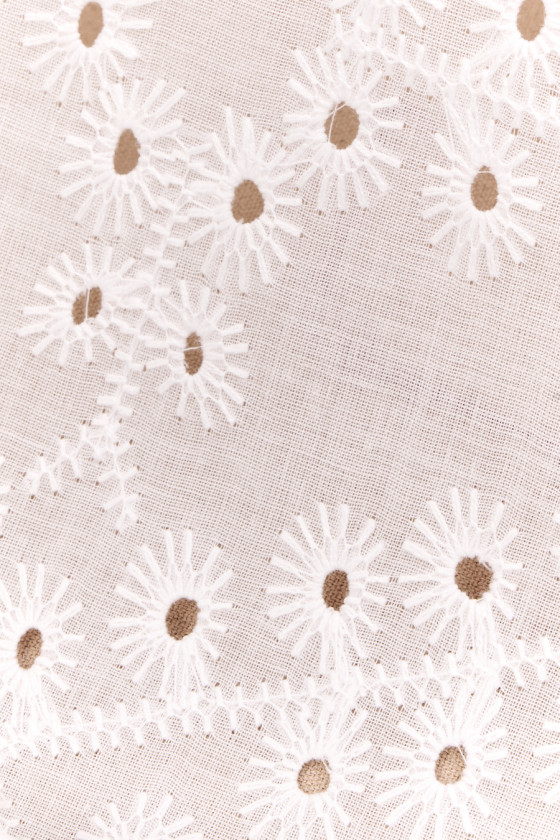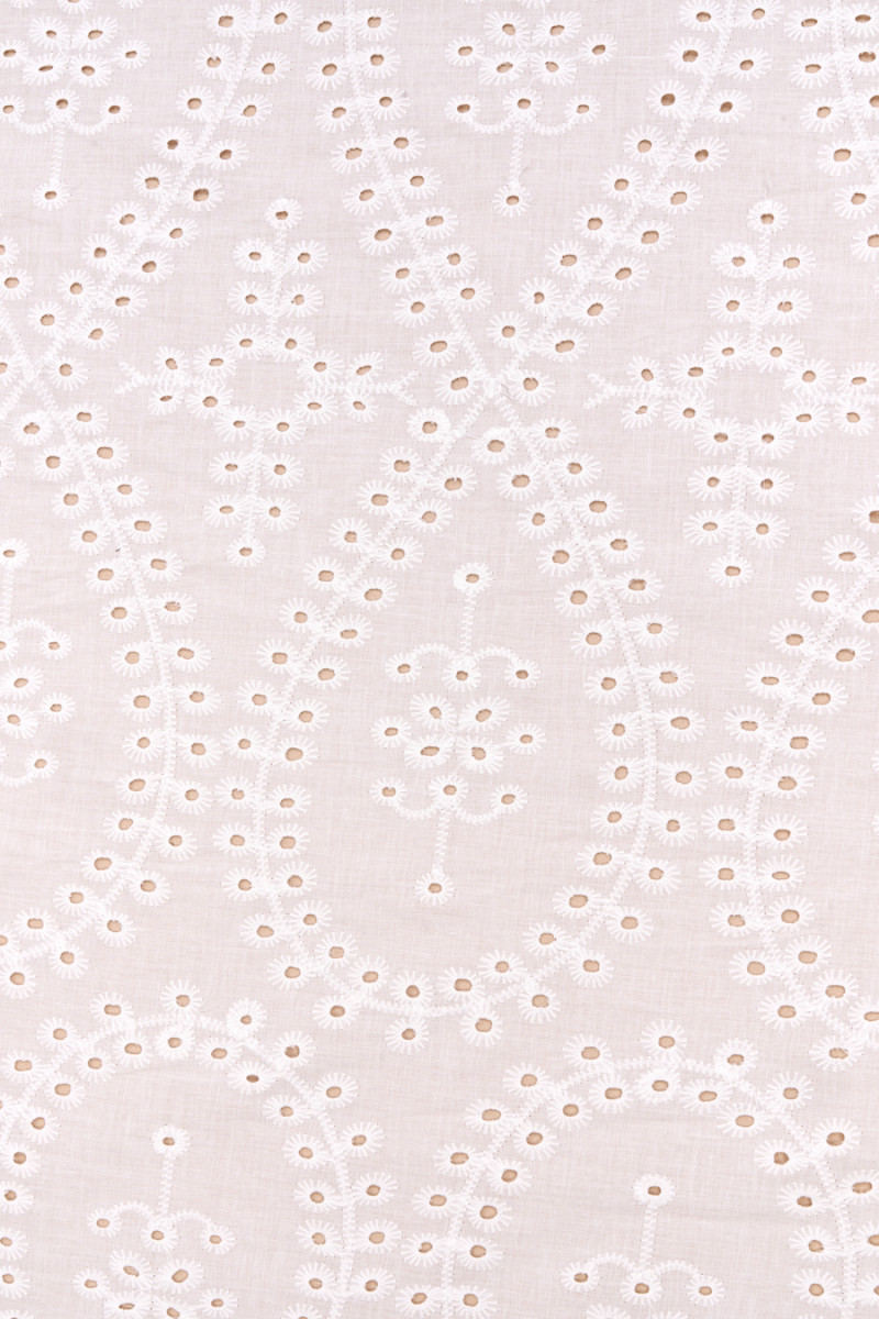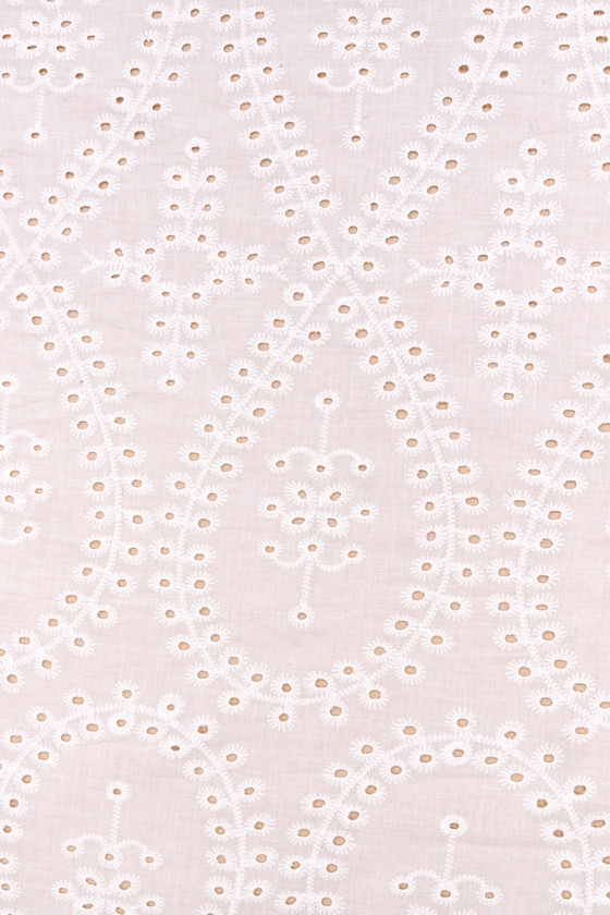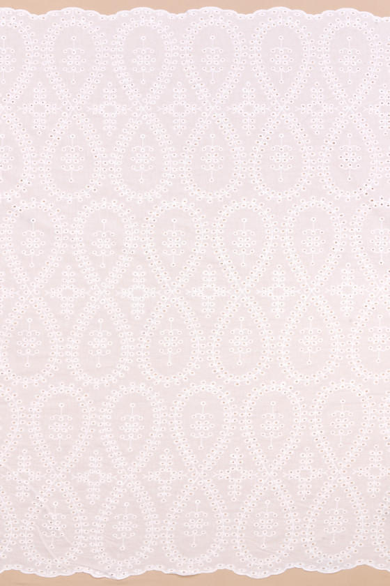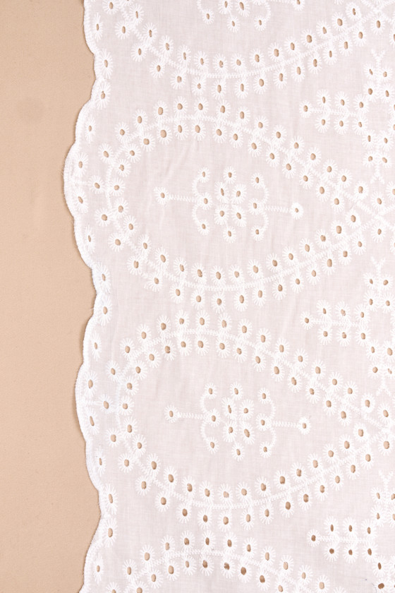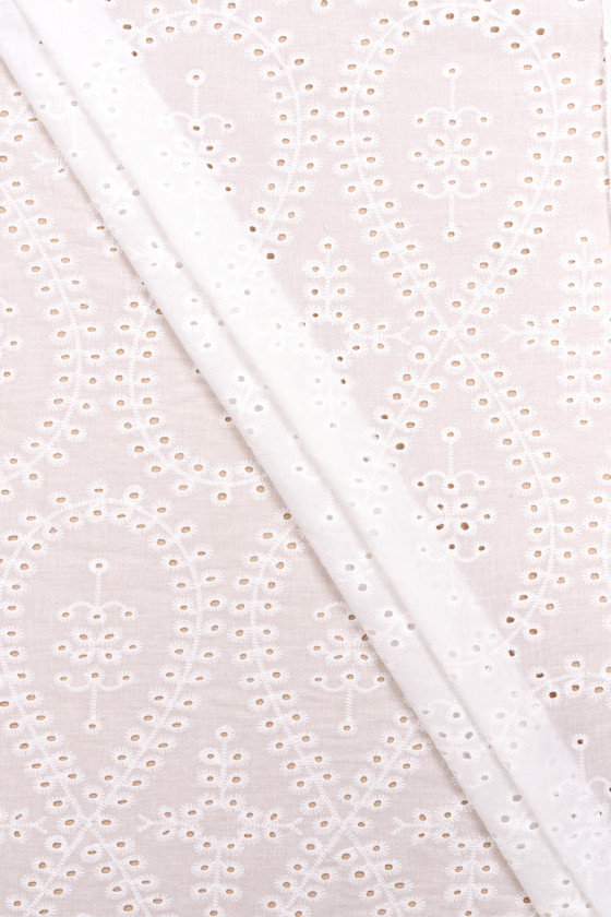 Italská látka ze 100% bavlny s výšivkou Richelieu v bílé barvě. Motiv drobných kvítků uspořádaných do osmiček, vzor je pravidelný a hustý. Látka je tenká, mírně průhledná, neelastická, má pěkně zakončené oba okraje. Nádherná, lehká nabídka pro halenky, košile a šaty.
