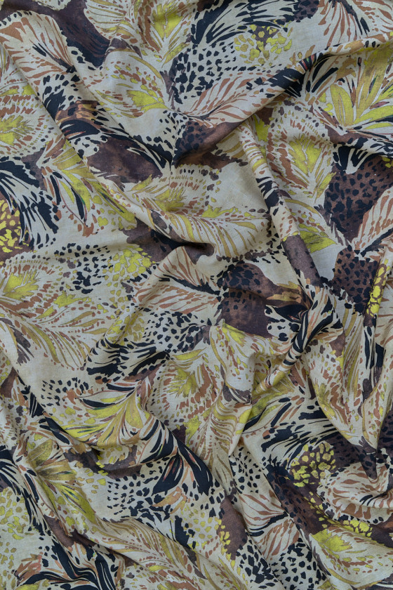 Italská látka ze 100% bavlny s motivem hustých listů v zelené a černé barvě na béžovém podkladu, navíc vyplněná tmavě hnědou barvou. Látka je tenká, měkká, neelastická a ve vazbě připomíná lněné látky. Zajímavá nabídka ideální pro letní oblečení - šaty, sukně, košile nebo šortky.