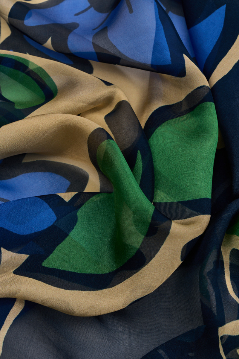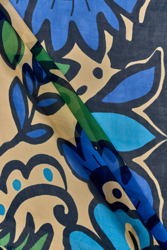 Italský bavlněný šifon s příměsí přírodního hedvábí v kupónu o rozměrech 95cm x 140cm. Velmi zajímavý motiv velkých, modrých a chrpových květů se zelenými listy na tmavě modrém a béžovém pozadí. Látka je tenká, průhledná, lehká a vzdušná, měkce sedí, takže je ideální pro ušití letních šatů, halenky nebo šály. Fantastická nabídka pro fanoušky originálních přírodních tkanin.