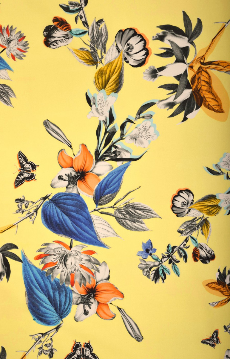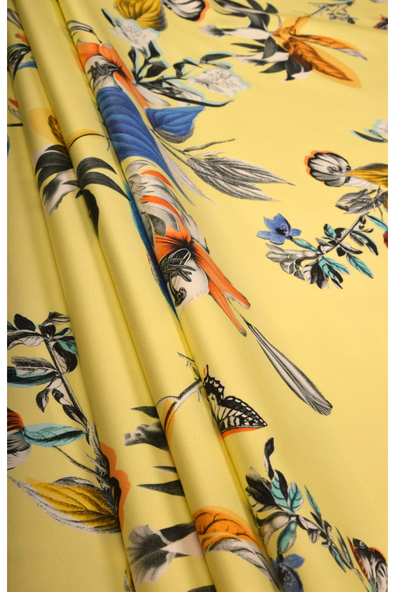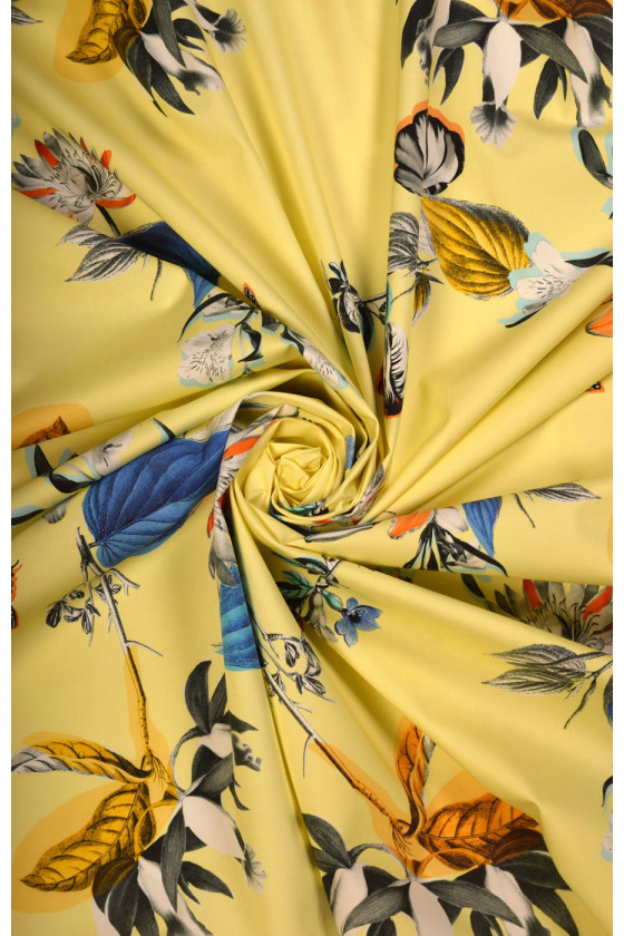 Bavlněná guma ve žluté barvě s květinovým potiskem. Doporučujeme pro šití vypasovaných šatů, sukní nebo kalhot.
