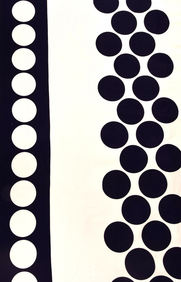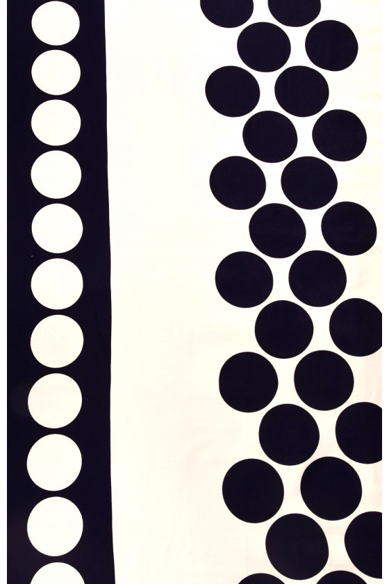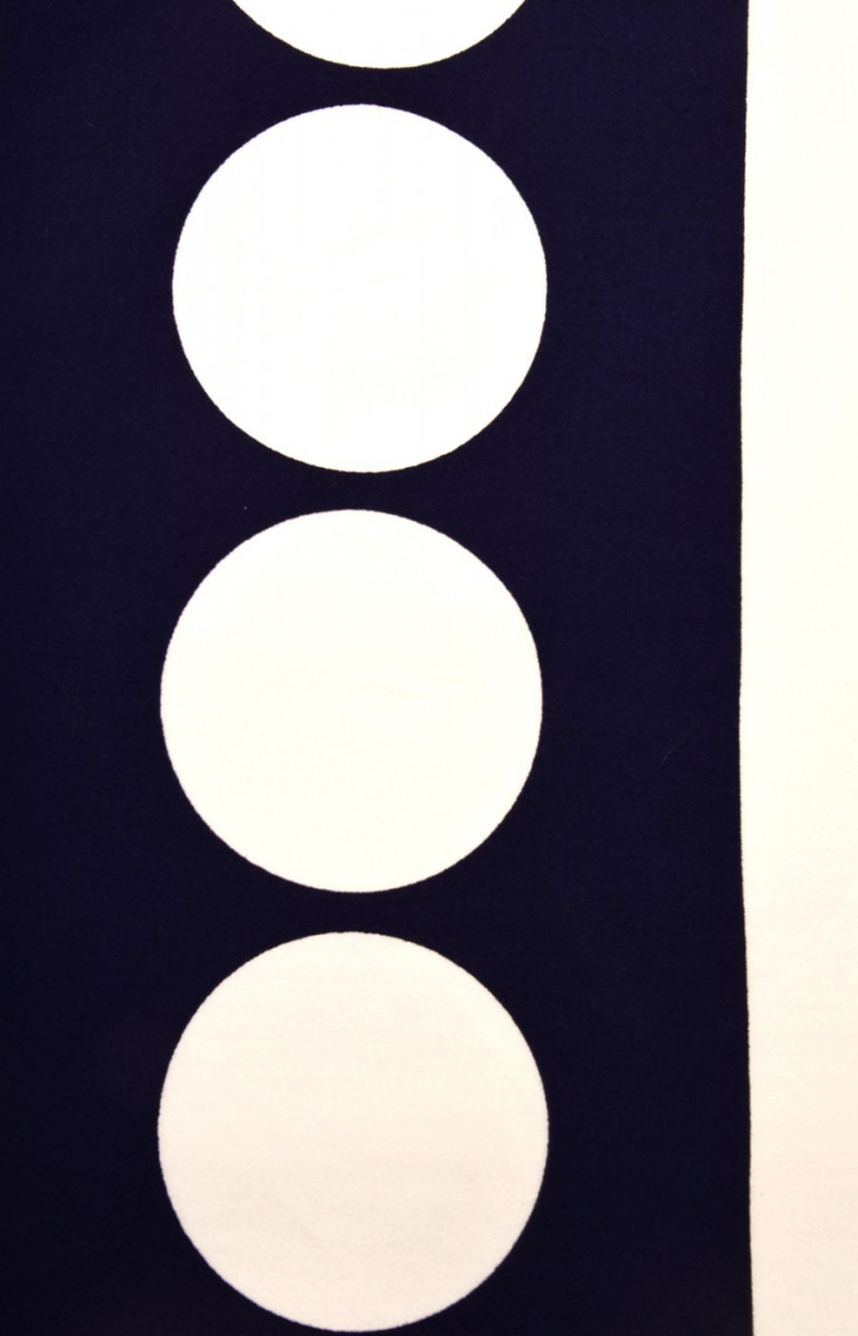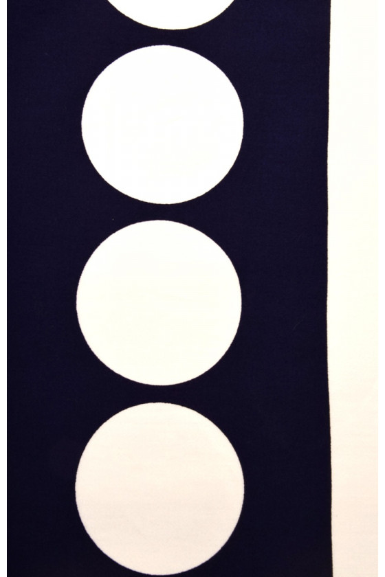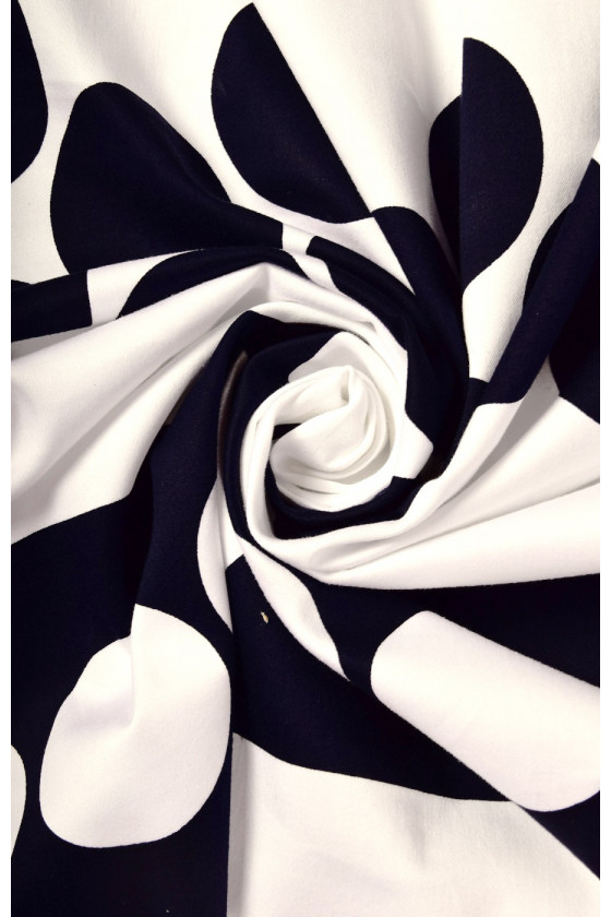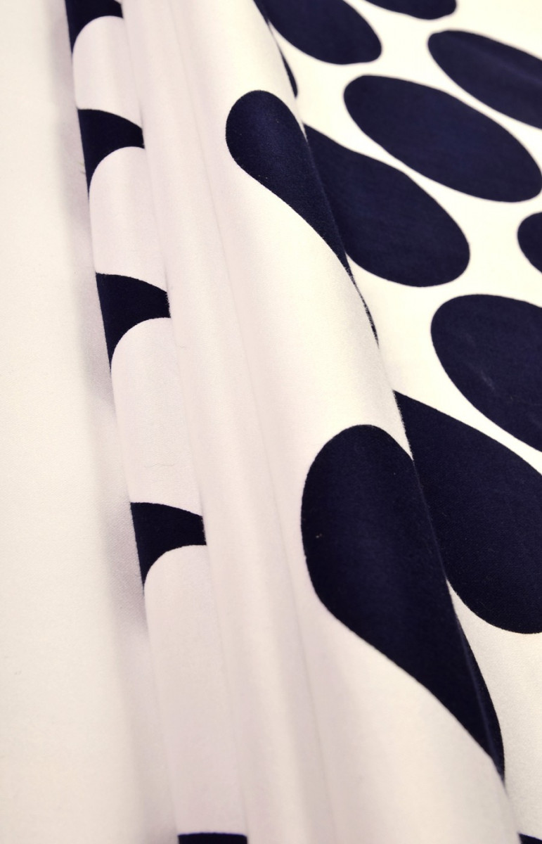 Silnější přírodní bavlna s elastanem v kupónu 150*60 cm, spodní pásek - bílá kolečka (7,5 cm) na tmavě modré je 14 cm. Barvy: bílá a tmavě modrá.