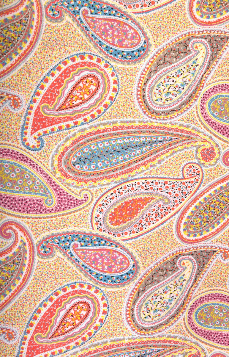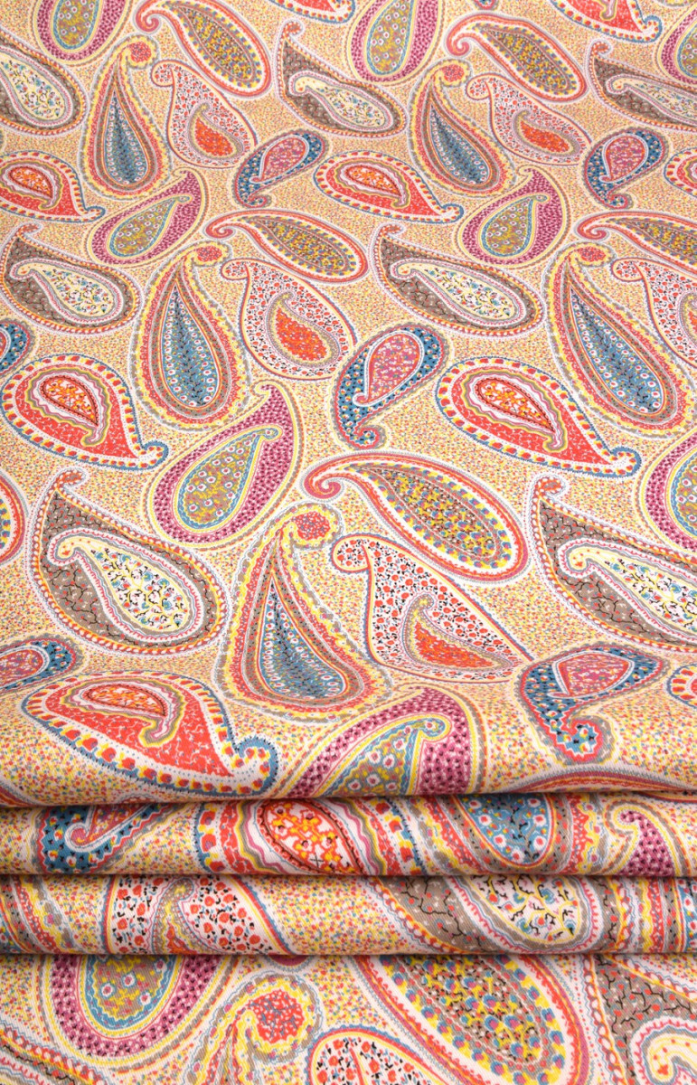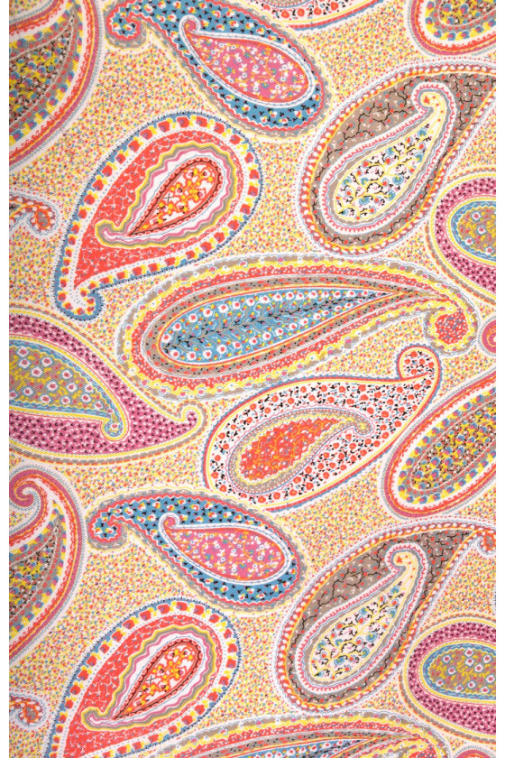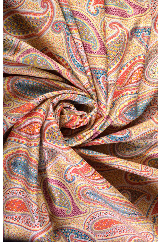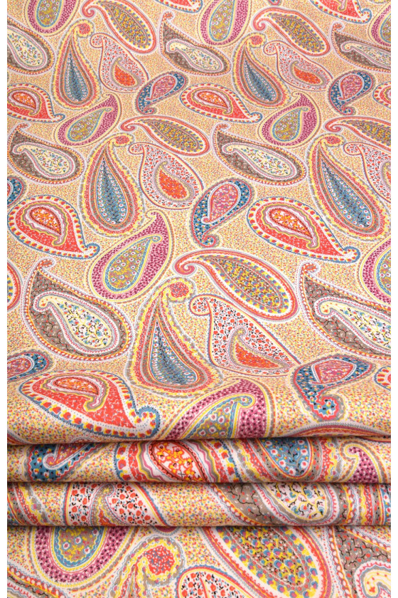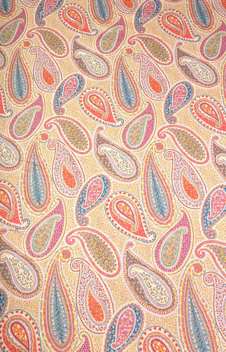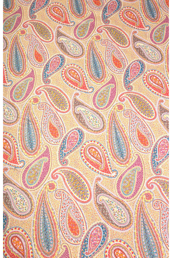 Bavlna s velmi zajímavým vzorem paisley, známá také jako turecká nebo orientální. Látka je poměrně silná, elastická, v pastelových barvách. Ideální pro kalhoty, šaty, sukně, saka nebo kabáty.
