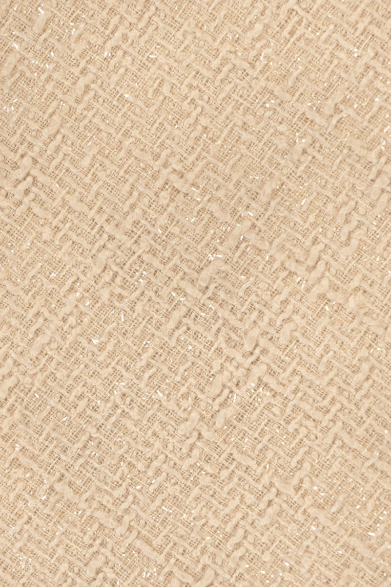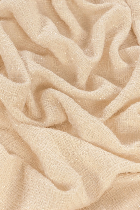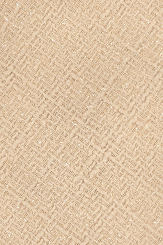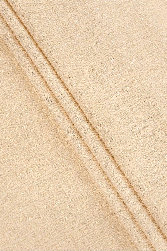 Italská kostýmní látka chanel v béžové barvě s vetkanou lurexovou nití. Ideální pro soupravy, jako jsou: sako + sukně nebo šaty. Lze jej také použít k šití tenkého přechodného kabátu.