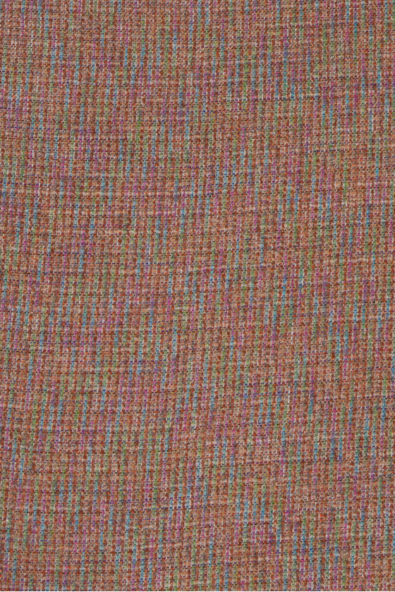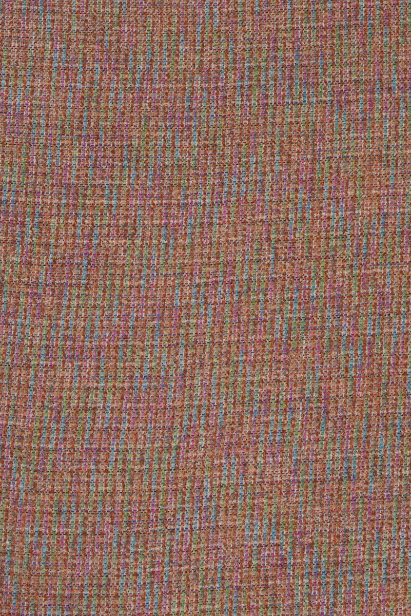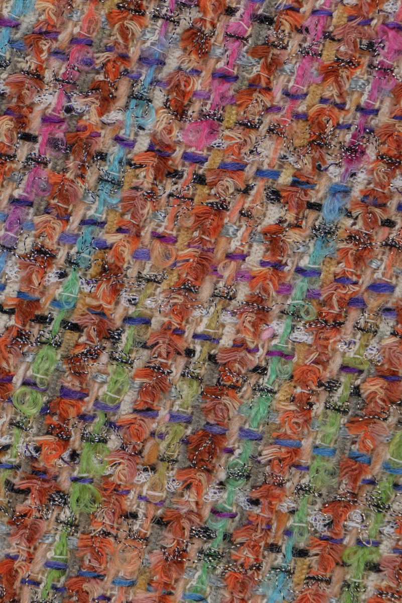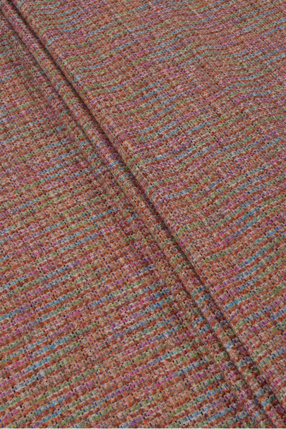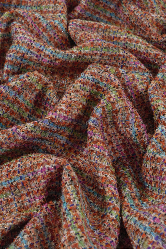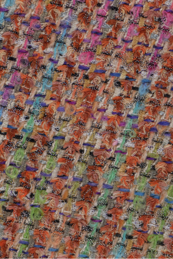 Italská kostýmní látka chanel tkaná z nití v těchto barvách: ecru, červená, růžová, modrá, zelená a stříbrná - lurexová nit. Látka je silnější, měkká, s hustou vazbou.