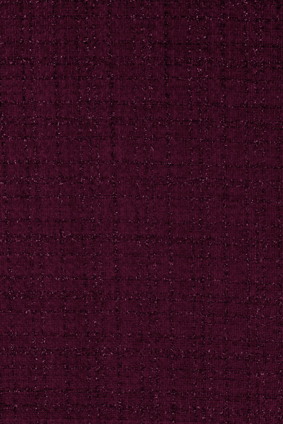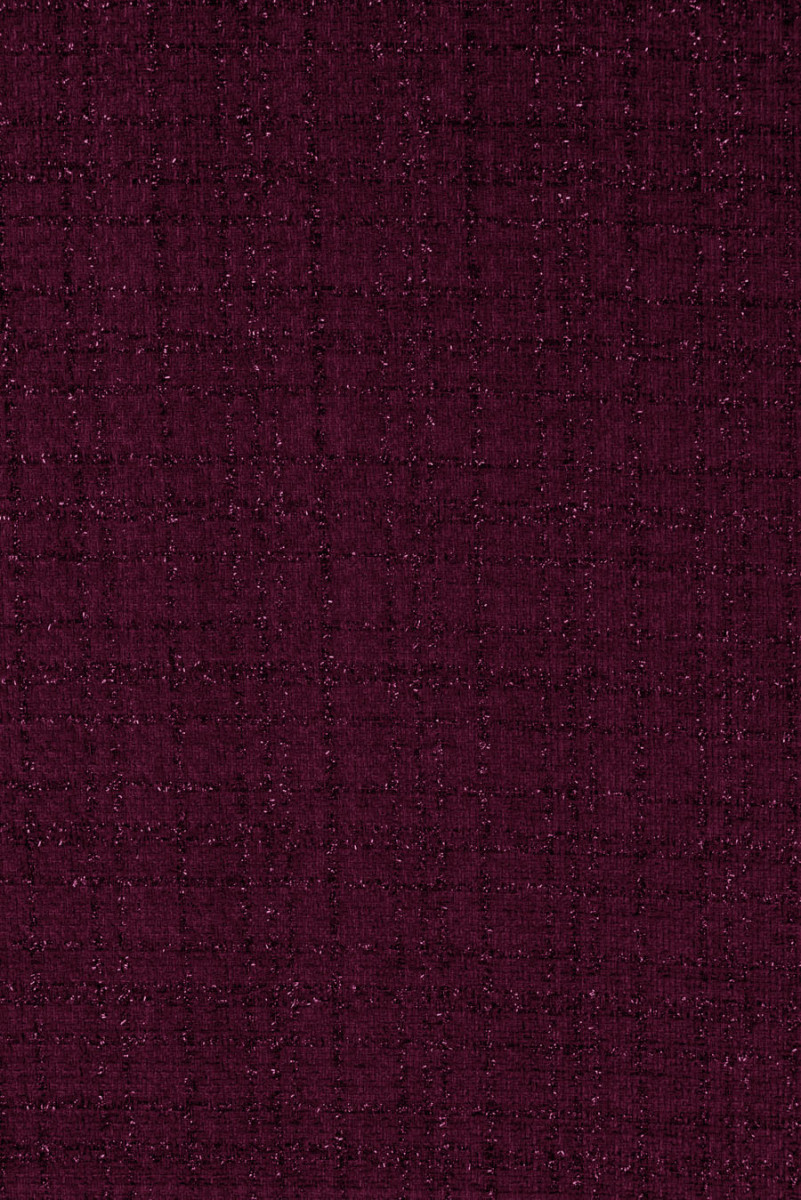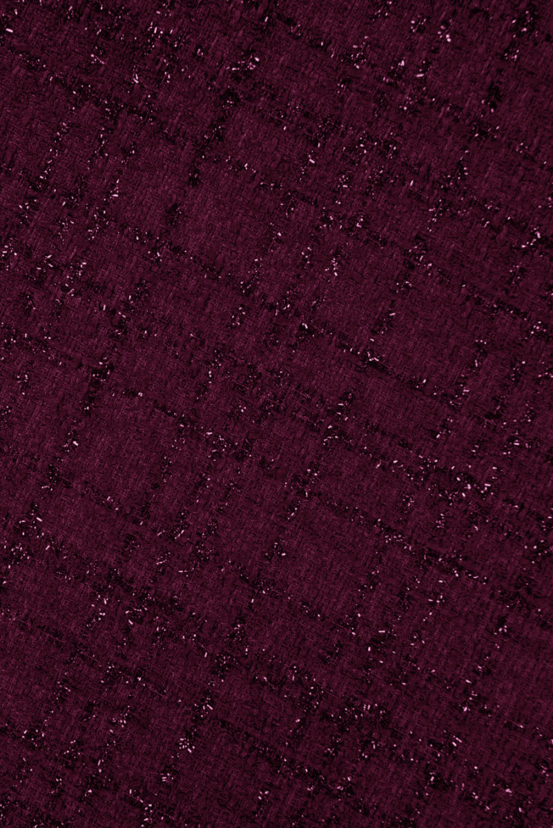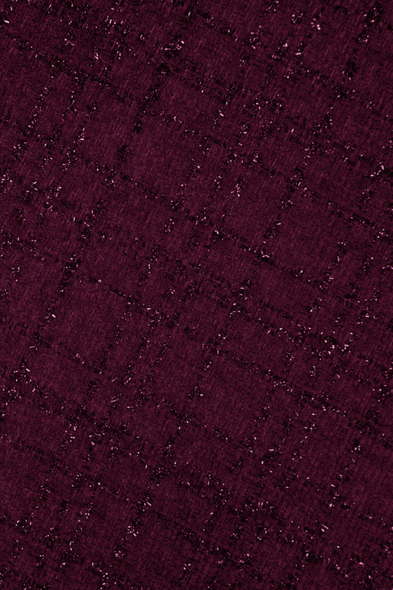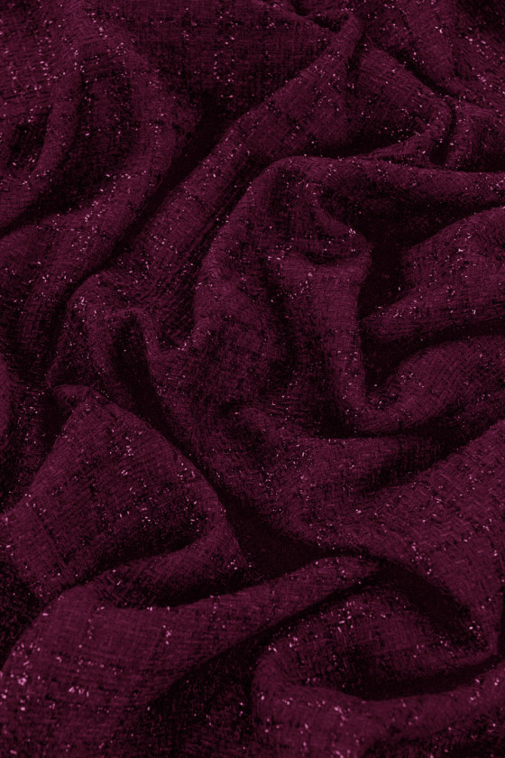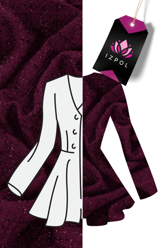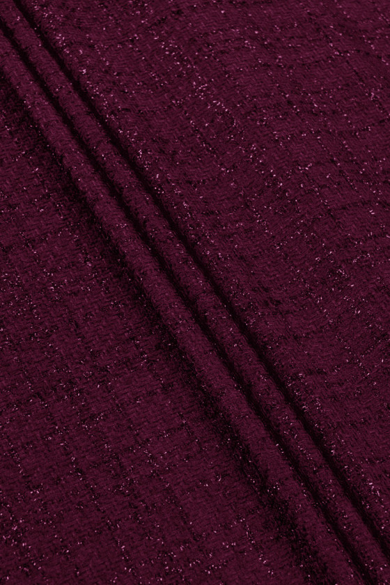 Italský kostým chanel ve vínové barvě s vetkanou lurexovou nití. Ideální pro soupravy, jako jsou: sako + sukně nebo šaty. Lze jej také použít k šití tenkého přechodného kabátu.