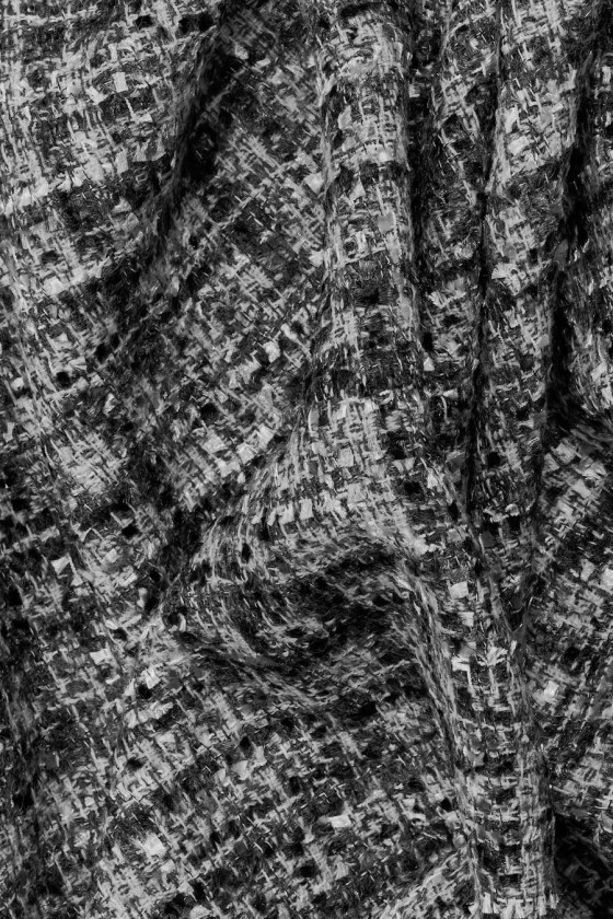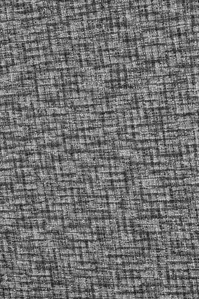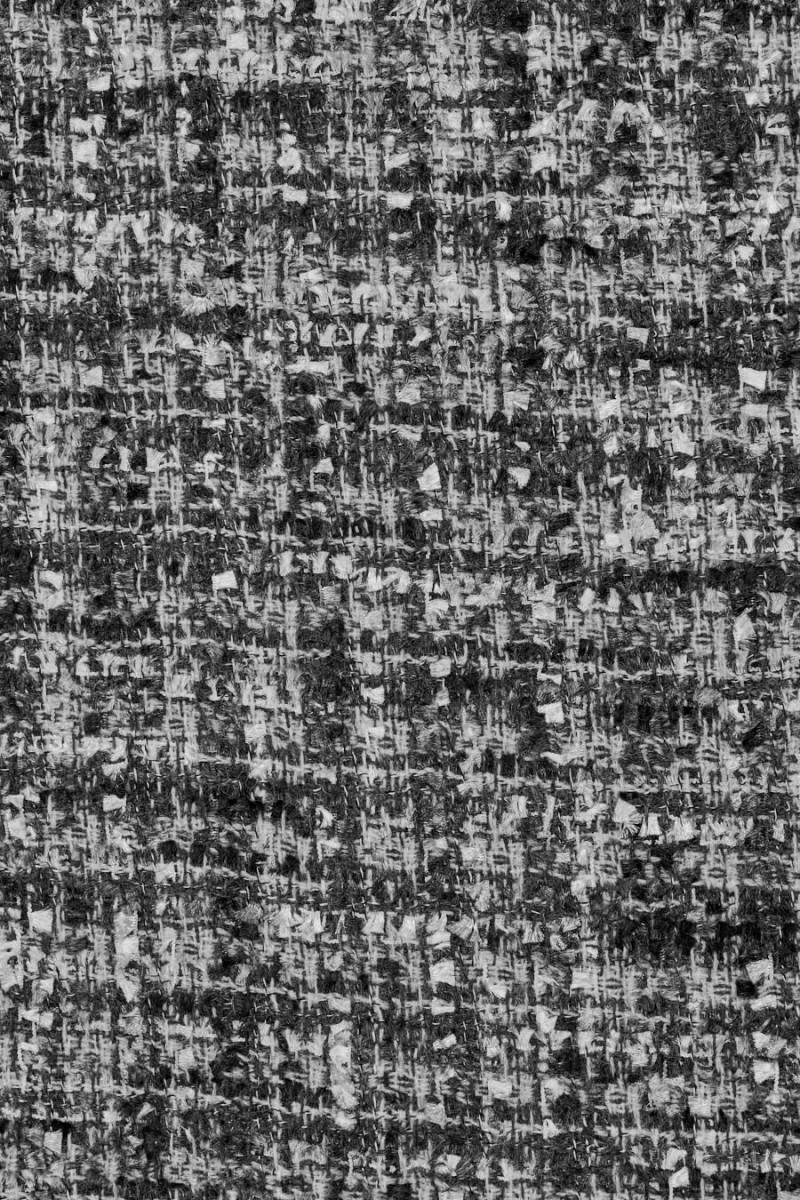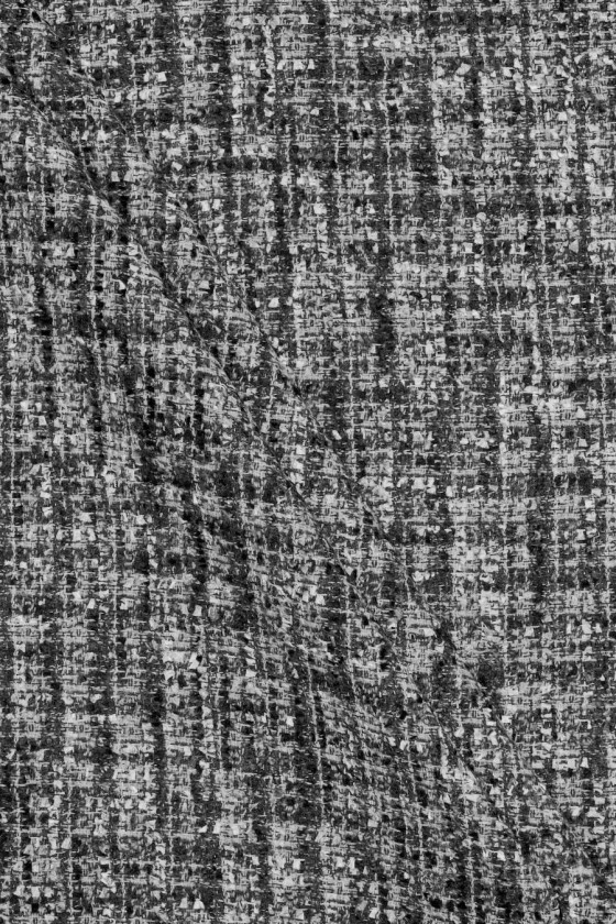 Kostýmová látka italský chanel v odstínech šedé, černé a krémové. Tkanina s volnější vazbou, zakončená mírně vyčnívajícími nitěmi, které připomínají drobné třásně, vyrobená převážně z přírodních vláken, a proto je velmi příjemná na nošení, měkká a neelastická. Skvěle se hodí pro šití elegantního i běžného oblečení. Skvělá nabídka pro fanoušky tvídových látek v nadčasových barvách.