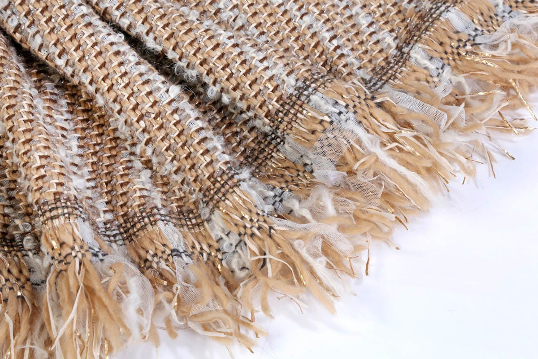 Originální kostýmní látka chanel protkaná tylem a lurexovou nití. Silná látka na kostýmy, silné svetry (typ kardigan), které lze ozdobit třásněmi. Včetně vlny a hedvábí!