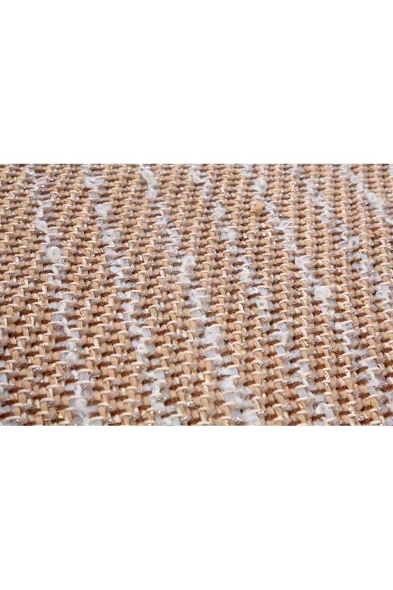 Originální kostýmní látka chanel protkaná tylem a lurexovou nití. Silná látka na kostýmy, silné svetry (typ kardigan), které lze ozdobit třásněmi. Látka je tkaná přírodními vlákny - vlnou a hedvábím, které zajistí pohodlí při nošení. Doporučujeme vybrat si podšívku, kterou najdete v našem obchodě. Materiál není elastický.