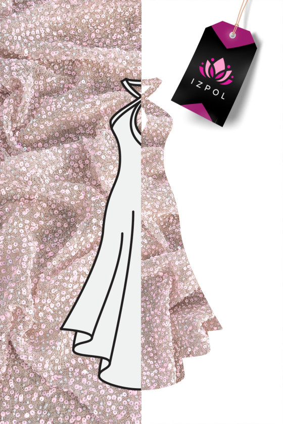 Italská látka (síťovina) ve světle růžové barvě, bohatě zdobená bílými a průhlednými korálky a matnými růžovými flitry, celek je lemován stříbrnou lurexovou nití. Látka je průhledná (vyžaduje podšívku), těžká, mírně elastická. Fantastický a velmi efektivní návrh na ušití večerních šatů, sukně nebo halenky.