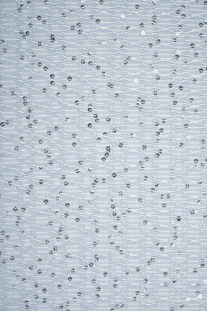 Italský kostým chanel v ledově modré barvě. Hladká látka s našitou síťovinou a zdobená drobnými flitry. Středně silná tkanina, neelastická, mírně tuhá. Ideální pro šití šatů, sukní nebo pro dekorativní účely.