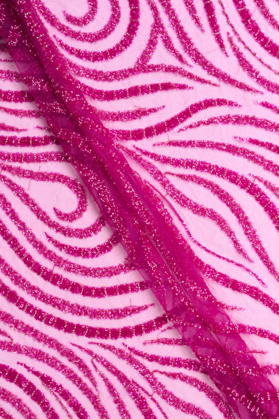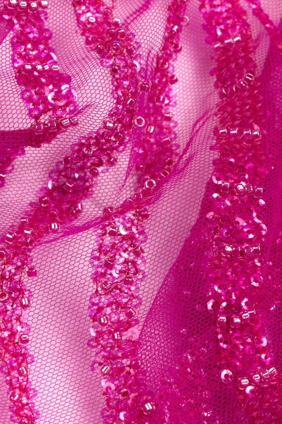 Italská večerní látka ve fuchsiové barvě. Tuhý tyl ve stejné barvě je bohatě zdoben korálky a flitry, které jsou uspořádány do tvaru vln. Směrem k jednomu okraji látky zesilují - šijeme ji po obvodu. Fantastický návrh na šití večerních šatů v nejmódnější barvě. Látka pro lidi, kteří sledují nejnovější módní trendy.