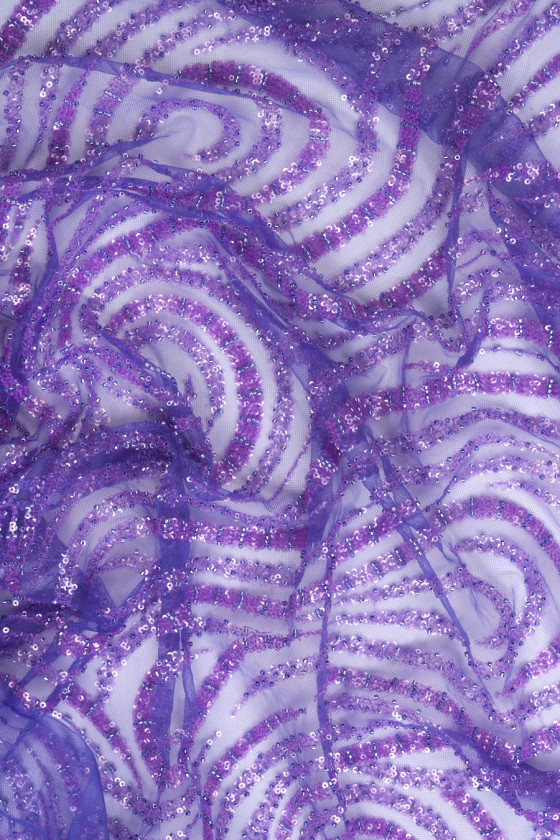 Italská večerní látka ve fialové barvě. Tuhý tyl ve stejné barvě je bohatě zdoben korálky a flitry ve dvou odstínech fialové, které jsou uspořádány do tvaru vln. Směrem k jednomu okraji látky zesilují - šijeme ji po obvodu. Fantastický návrh na šití večerních šatů v nejmódnější barvě. Látka pro lidi, kteří sledují nejnovější módní trendy.