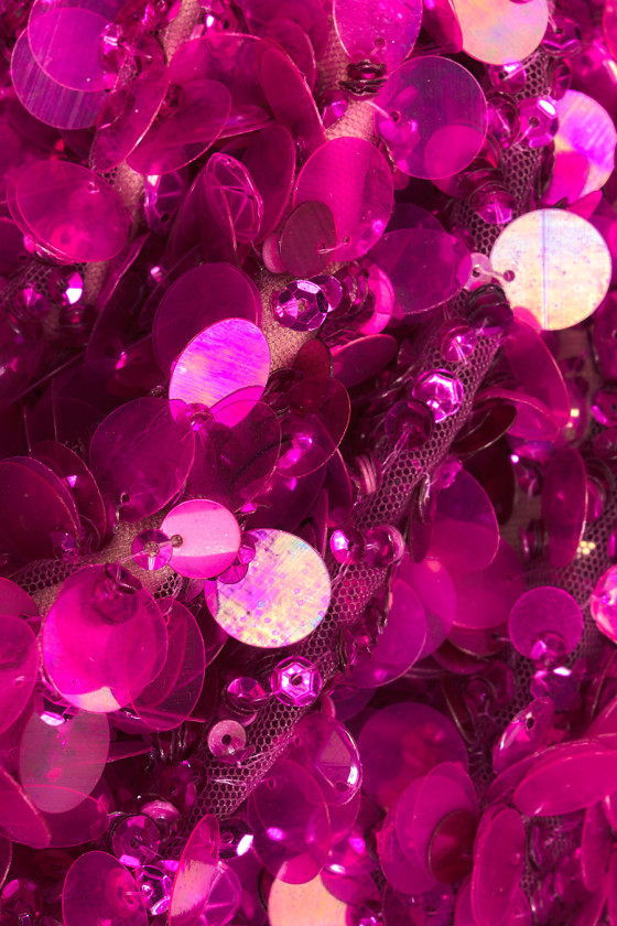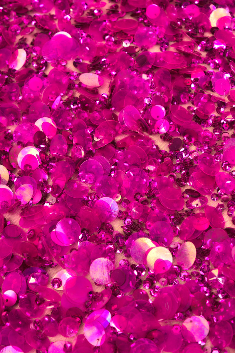 Italský tuhý tyl s klasickými fuchsiovými očky. Je velmi bohatě zdobena velkými, průhlednými flitry ve fuchsiové barvě, mají průměr asi 1 cm a menšími flitry ve stejné barvě. Látka je velmi efektní, mírně průhledná (vyžaduje podšívku), těžká a neelastická. Fantastický návrh na ušití večerních šatů, sukně nebo halenky ve velmi zajímavé edici.