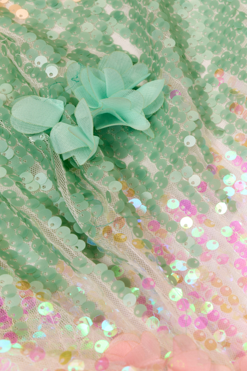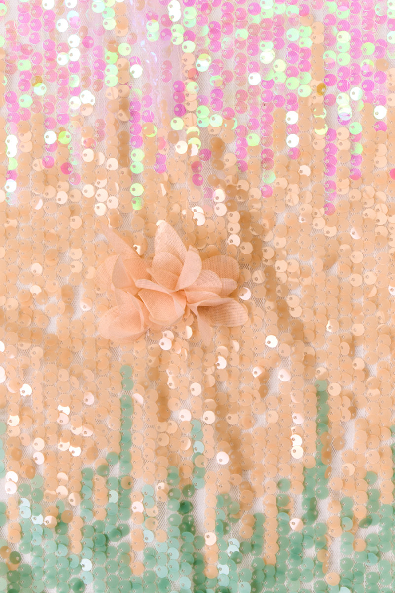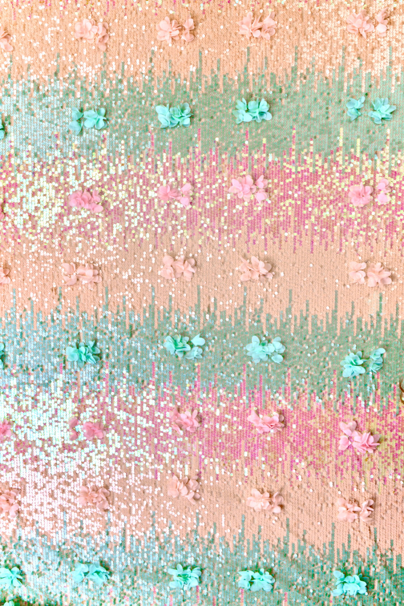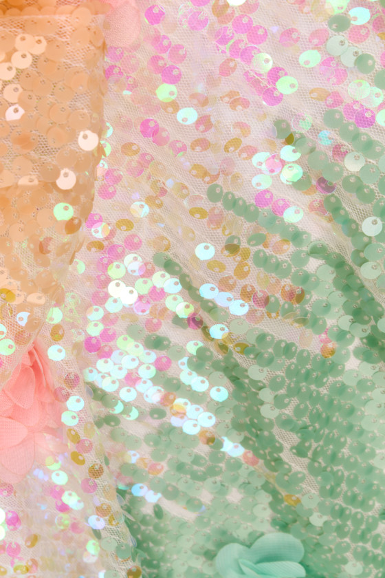 Italský tyl s klasickými krémovými očky s hustě šitými mátovými, růžovými a lososovými flitry. Flitry jsou pohyblivé a duhové, látka je obohacena o pravidelně šité šifonové květy, které mírně vystupují a vytvářejí 3D efekt. Krásné barvy flitrů vytvářejí stínovací efekt, který každých zhruba 20 cm přechází z jedné barvy do druhé. Fantastický návrh na ušití večerních šatů, sukně nebo halenky ve velmi originální edici.