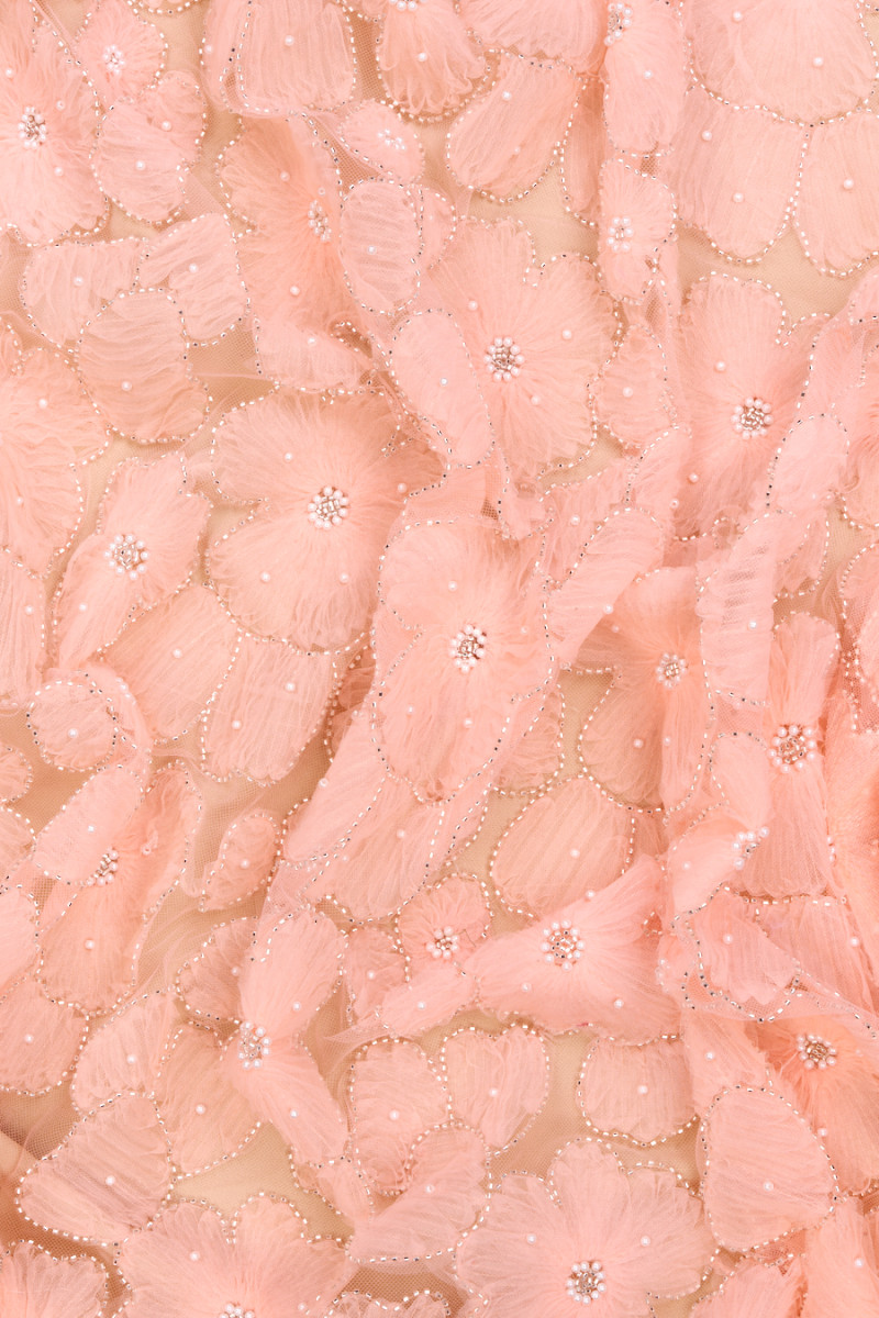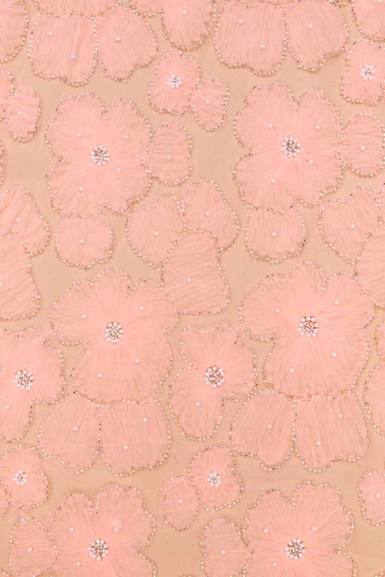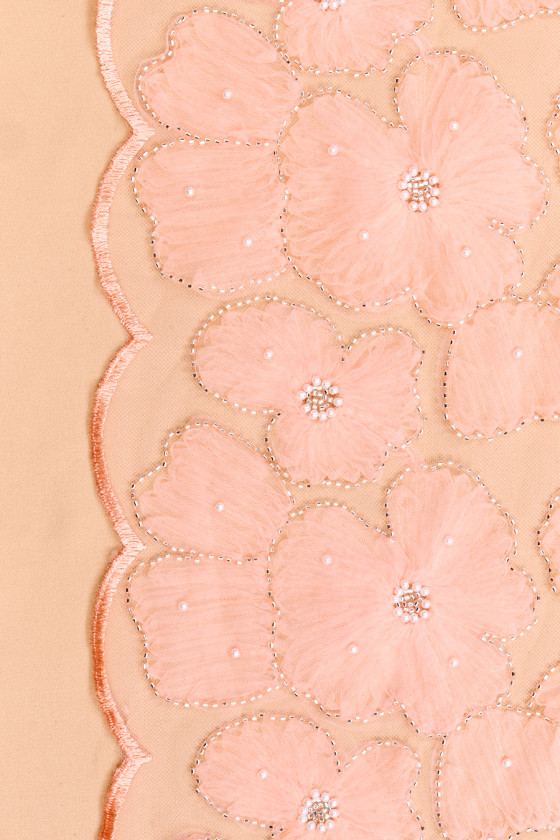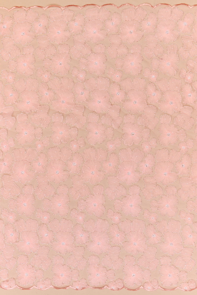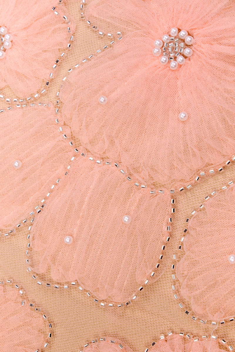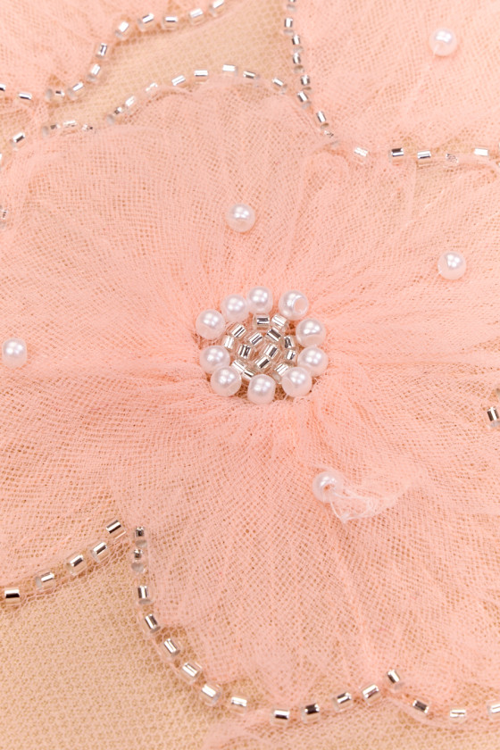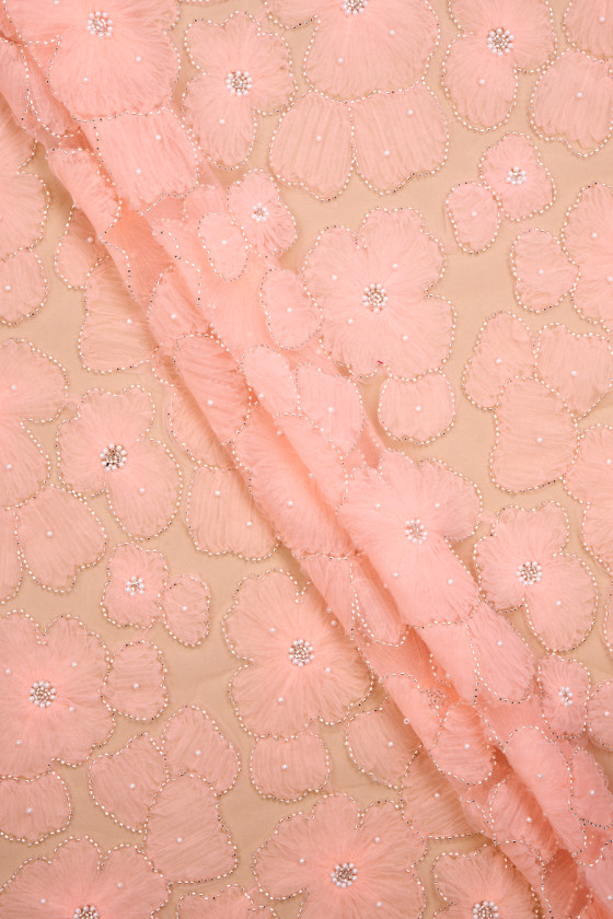 Působivý tyl s květy a korálky v lososové barvě. Květy jsou vyrobeny z tylu a tvoří mírně konvexní strukturu, okraje květů jsou ze stříbrných korálků a jejich středy jsou z perleťových korálků. Tkanina je pružná, mírně tuhá, vyžaduje podložku, oba okraje látky jsou zakončeny lososovým hrotem. Zajímavý návrh pro vytváření formálních outfitů, jako jsou šaty, sukně nebo halenky.