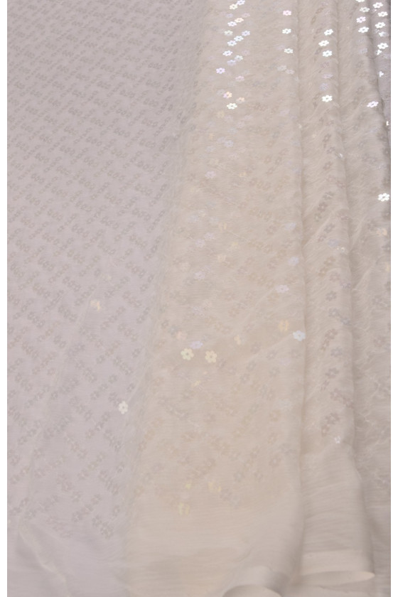 Hedvábný šifon mírně zmačkaný v barvě ecru, vyšívaný drobnými flitry - květinami, které tvoří šachovnici. Látka je velmi efektní, průhledná - doporučujeme zvolit podšívku. Lze jej šít na formální i svatební oblečení - šaty, halenky, šály.