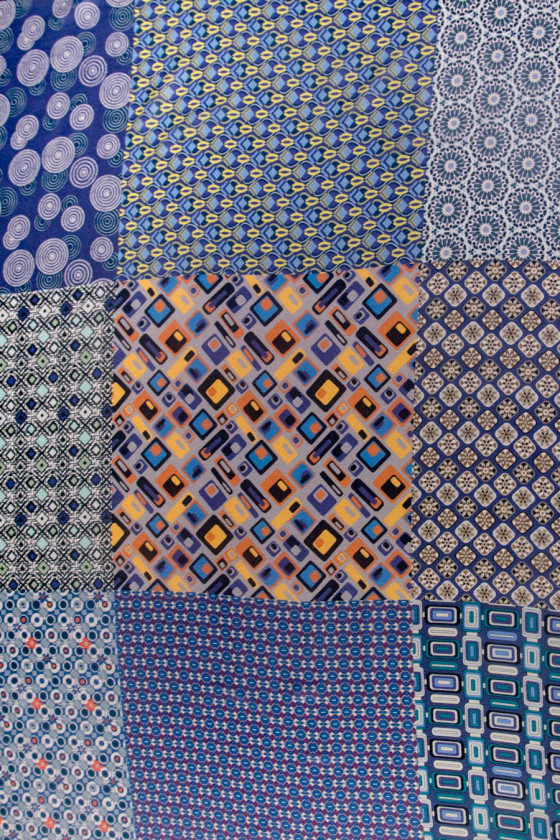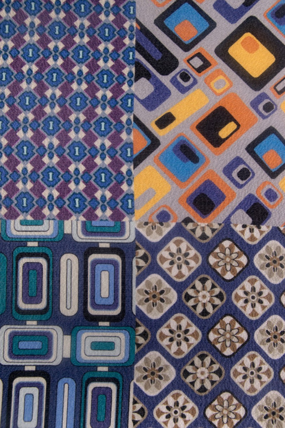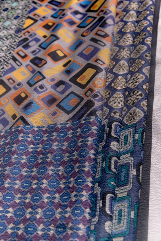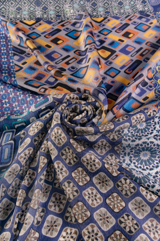 Originální hedvábný šifon, lehce zvlněný v barevném patchworkovém vzoru. Látka je dodávána v kupónech 140*140 cm v modré, fialové, odstínech oranžové.