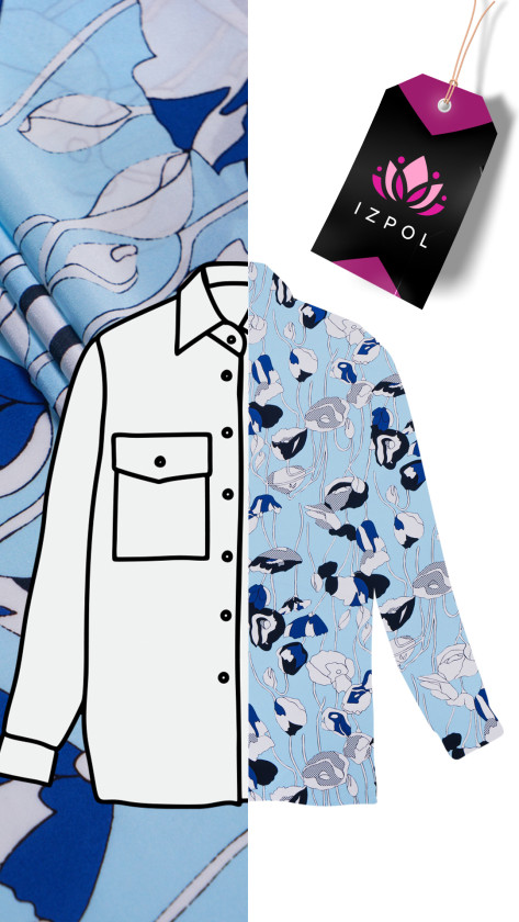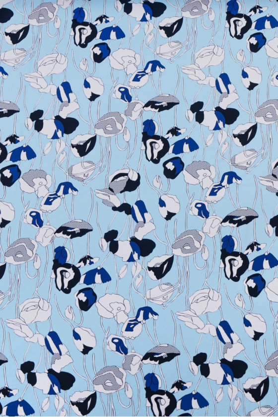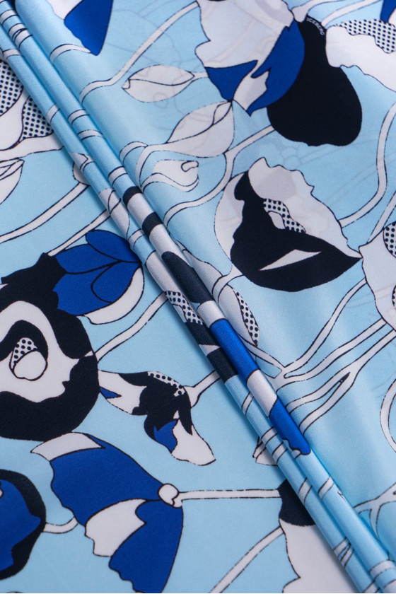 Italský hedvábný krep - mírně elastický, signovaný jménem známého módního domu. Motiv bílých, černých a tmavě modrých květů na modrém pozadí. Ideální pro šití šatů, halenky, sukně, šálu.