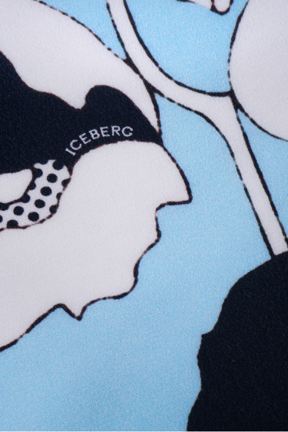 Italský hedvábný krep - mírně elastický, podepsaný názvem známého módního domu. Bílo-černo-tmavě modrý květinový motiv na modrém pozadí.