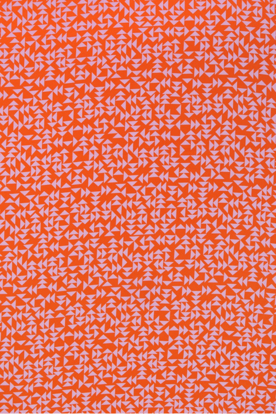 Italský hedvábný krep - oranžový s malými trojúhelníčky ve špinavě růžové barvě. Hedvábný krep je jemná, tenká, polomatná látka. Lze s ním vykouzlit vzdušné šaty, jemné halenky, šátky, šátky.