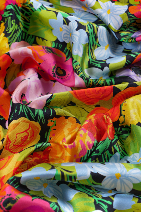 Italský 100% hedvábný kepr s květinovými motivy na černém podkladu, motivy jsou uspořádány do tvaru čtverců o šířce 20 cm.