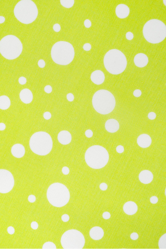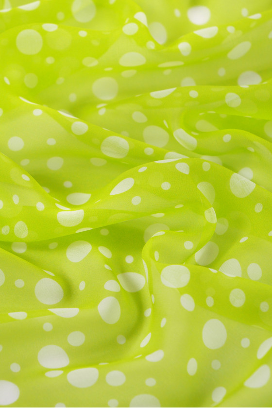Italský šifon 100% hedvábí v pikantní zelené barvě s motivem bílých, nepravidelných puntíků. Šifon z přírodního hedvábí je velmi jemná, vzdušná a průhledná látka.