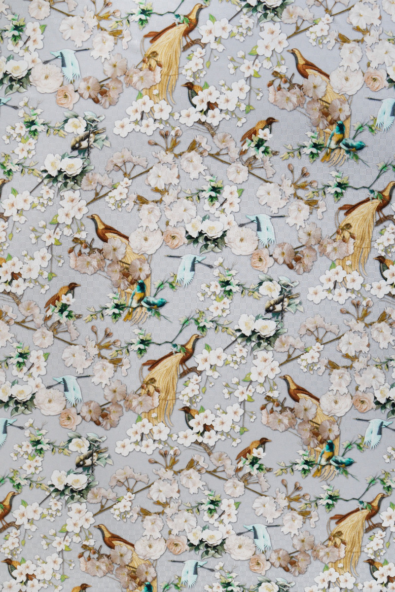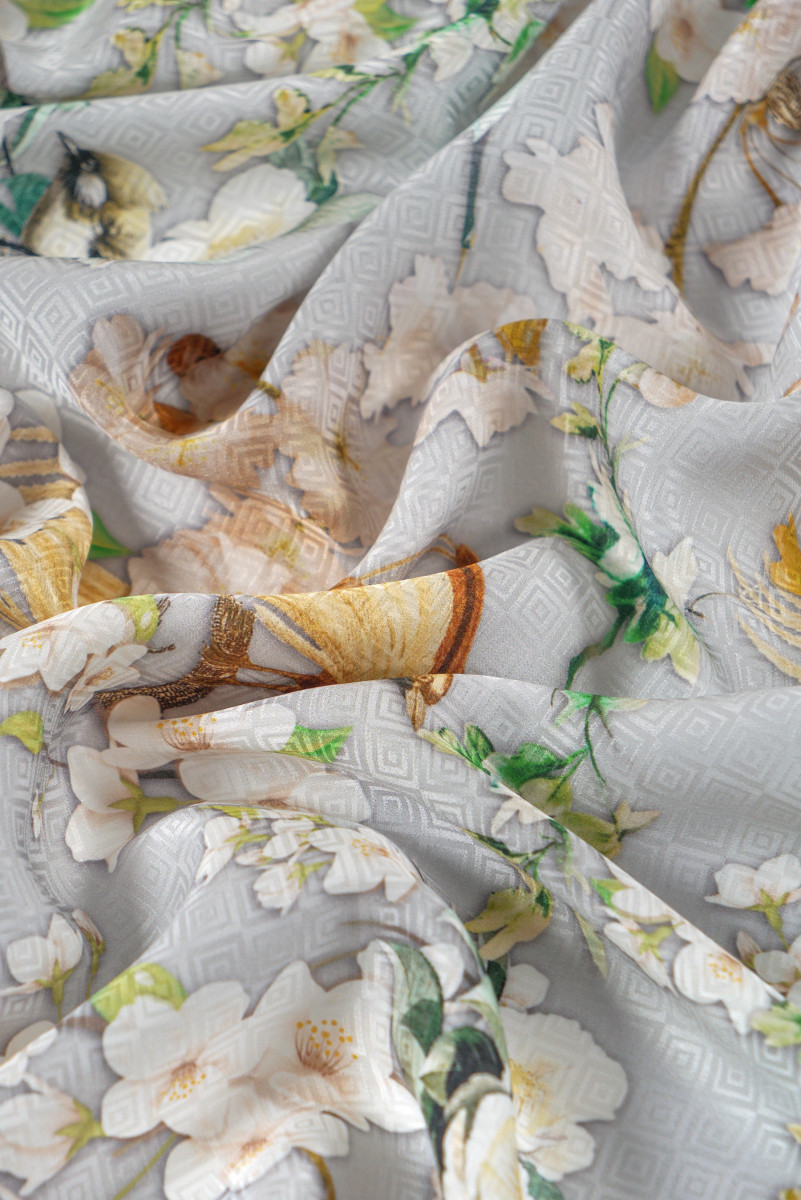 Krásná, italská 100% hedvábná látka ve světle šedé barvě s motivem květin a ptáků. Látka s velmi originální žakárovou vazbou v podobě matně lesklé kostky.