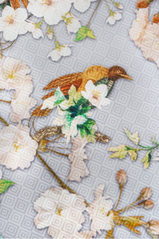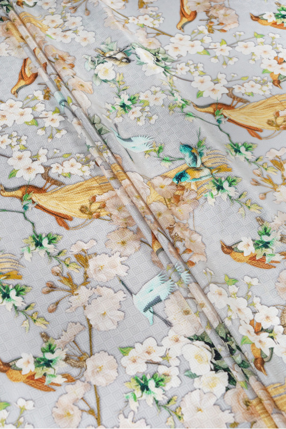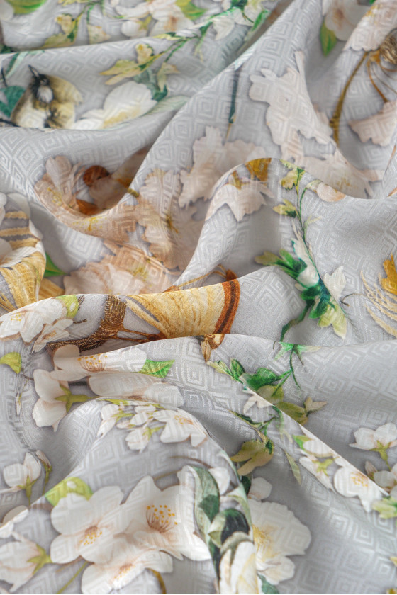 Krásná, italská 100% hedvábná látka ve světle šedé barvě s motivem květin a ptáků. Látka s velmi originální žakárovou vazbou v podobě matně lesklé kostky. Neelastická, lehká, neprůhledná látka s jemným leskem - ideální pro ušití elegantních šatů, halenky, sukně nebo šálu.