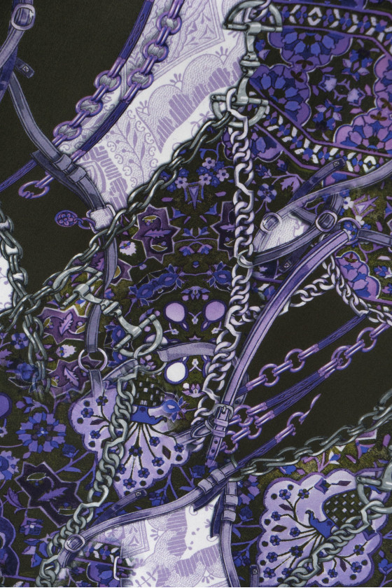 Italský, silnější šifon 100% hedvábí s motivem šedých a fialových řetízků na velmi tmavě zeleném podkladu. Šifon z přírodního hedvábí je velmi jemná, vzdušná, mírně průhledná látka.