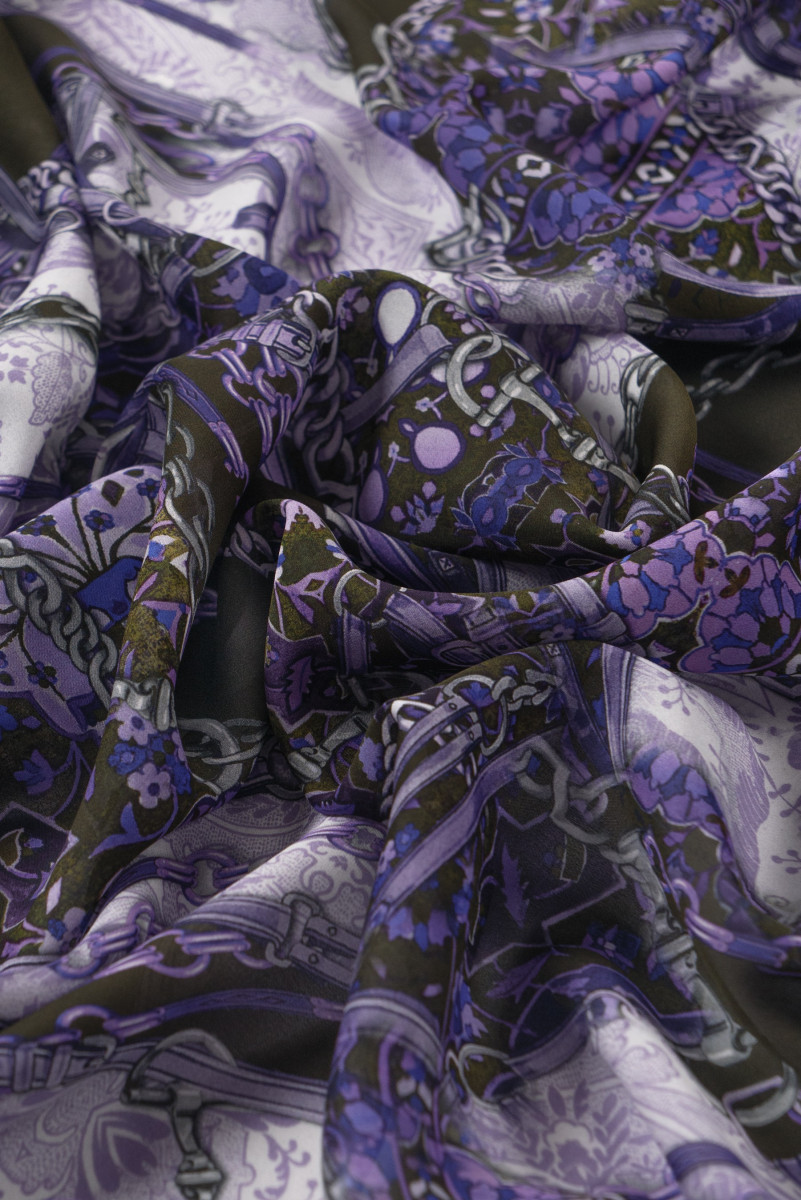Italský, silnější šifon 100% hedvábí s motivem šedých a fialových řetízků na velmi tmavě zeleném podkladu. Šifon z přírodního hedvábí je velmi jemná, vzdušná, mírně průhledná látka. Ideální pro vzdušné šaty a halenky. Neelastická tkanina.