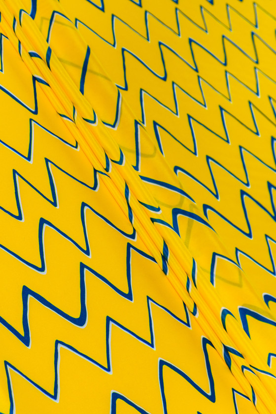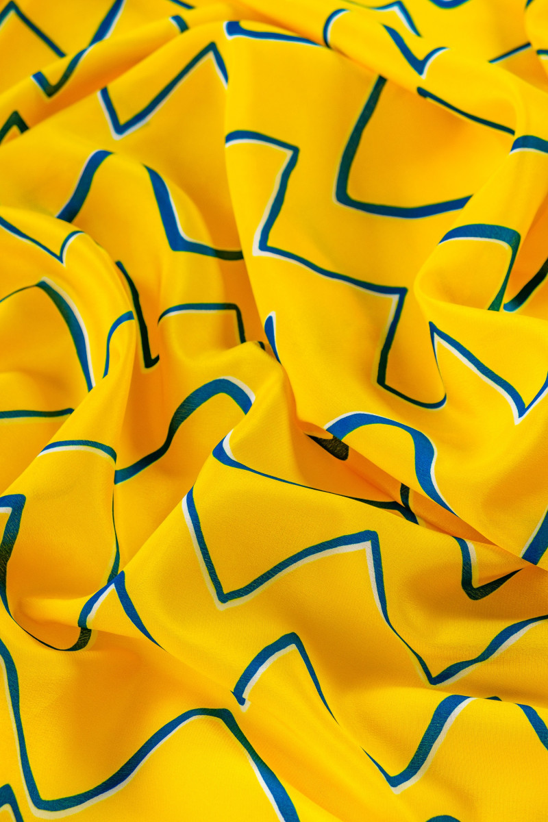 Italský 100% hedvábný krep ve žluté barvě s motivem modrých cikcak, uspořádaných svisle (po celé délce látky). Hedvábný krep je jemná, tenká, polomatná látka. Je měkký na dotek a velmi dobře sedí.